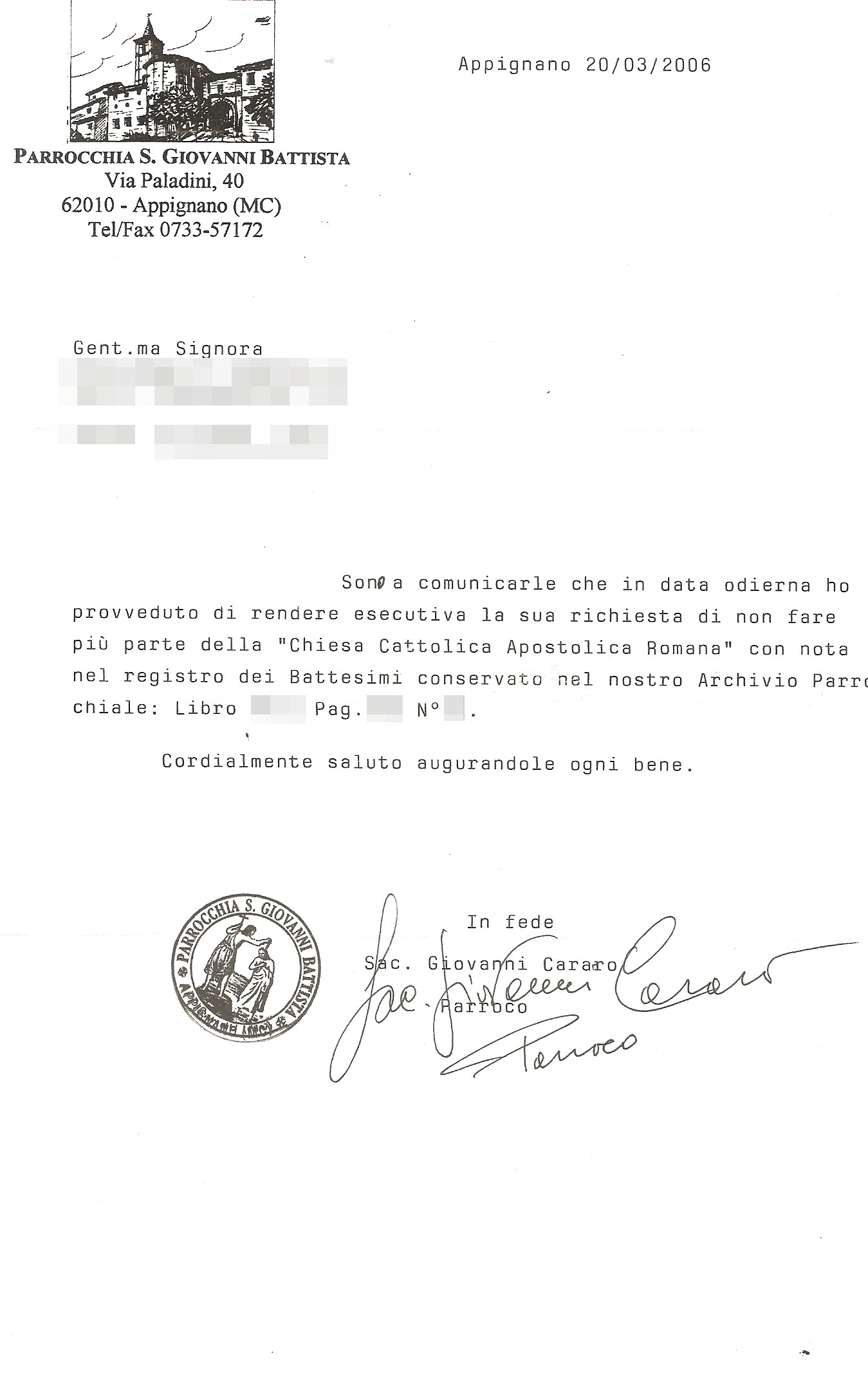 Una persona ha chiesto la rettifica dei dati relativi al proprio battesimo avvenuto a S. Giovanni Battista - APPIGNANO (MC) il 20/03/2006, dichiarando di non voler più far parte della Chiesa Cattolica.