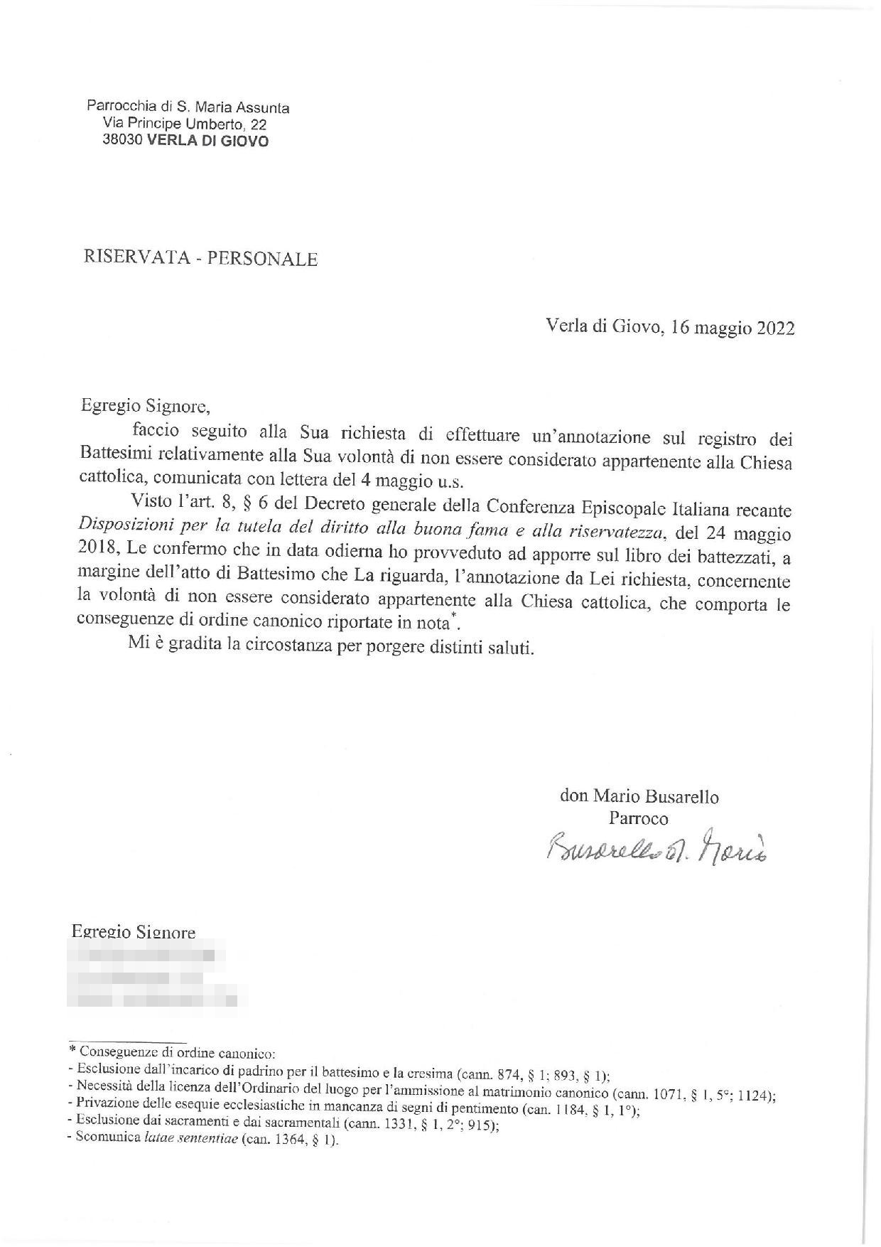 Una persona ha chiesto la rettifica dei dati relativi al proprio battesimo avvenuto a Santa Maria Assunta - VERLA DI GIOVO (TN) il 26/05/2022, dichiarando di non voler più far parte della Chiesa Cattolica.
