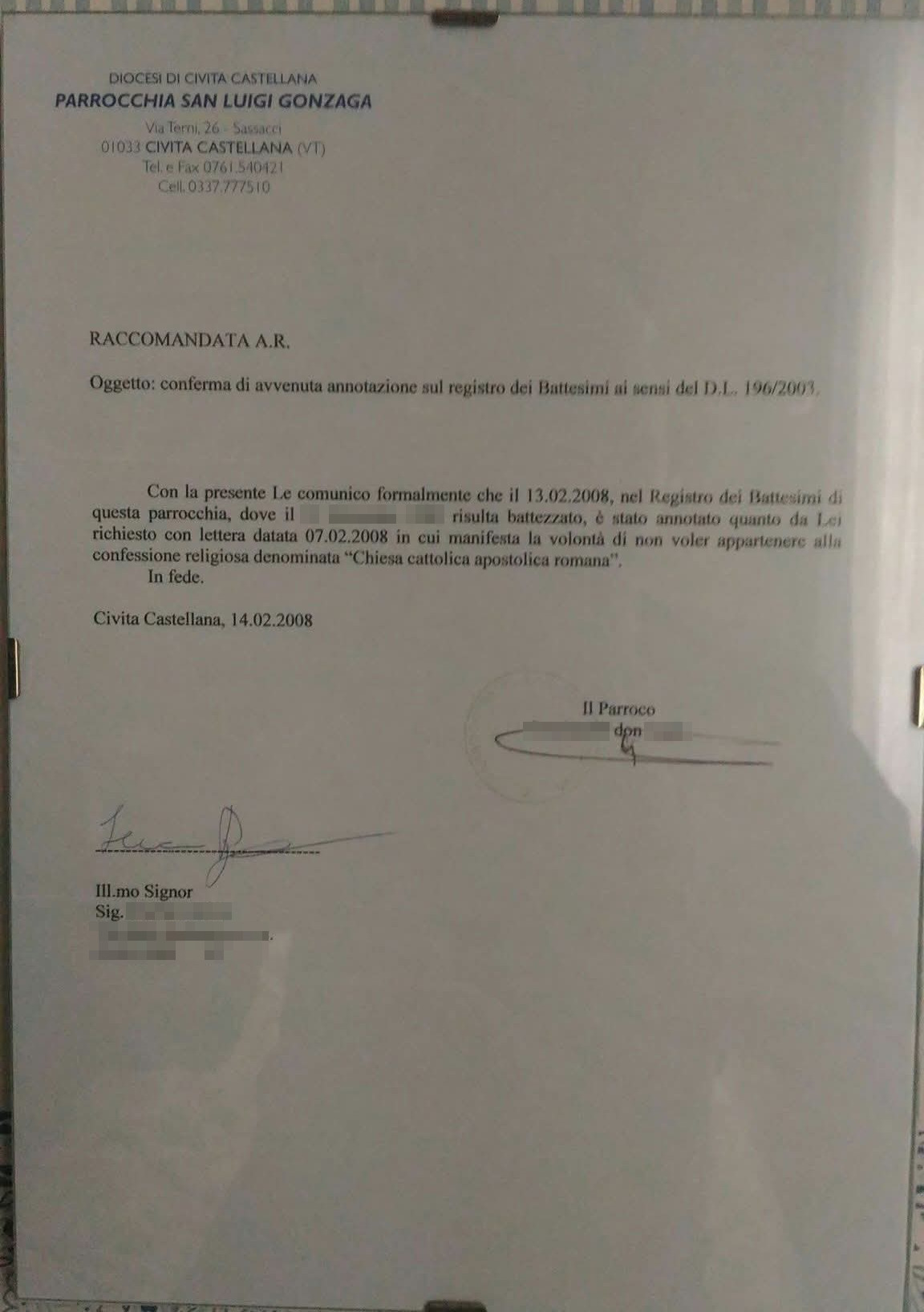 Una persona ha chiesto la rettifica dei dati relativi al proprio battesimo avvenuto a S. Luigi Gonzaga - CIVITA CASTELLANA (VT) il 14/02/2008, dichiarando di non voler più far parte della Chiesa Cattolica.