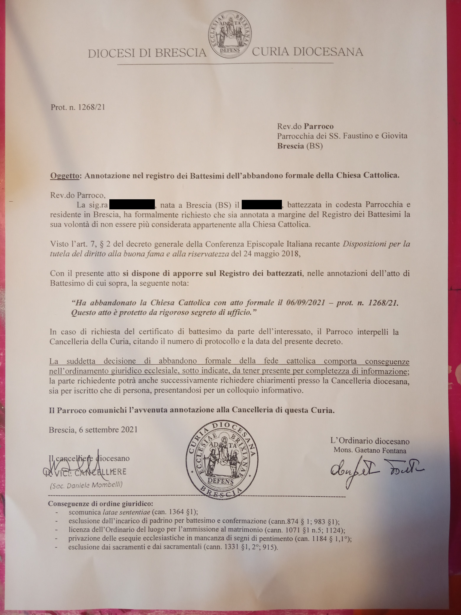 Una persona ha chiesto la rettifica dei dati relativi al proprio battesimo avvenuto a Santi Faustino e Giovita - BRESCIA (BS) il 06/09/2021, dichiarando di non voler più far parte della Chiesa Cattolica.
