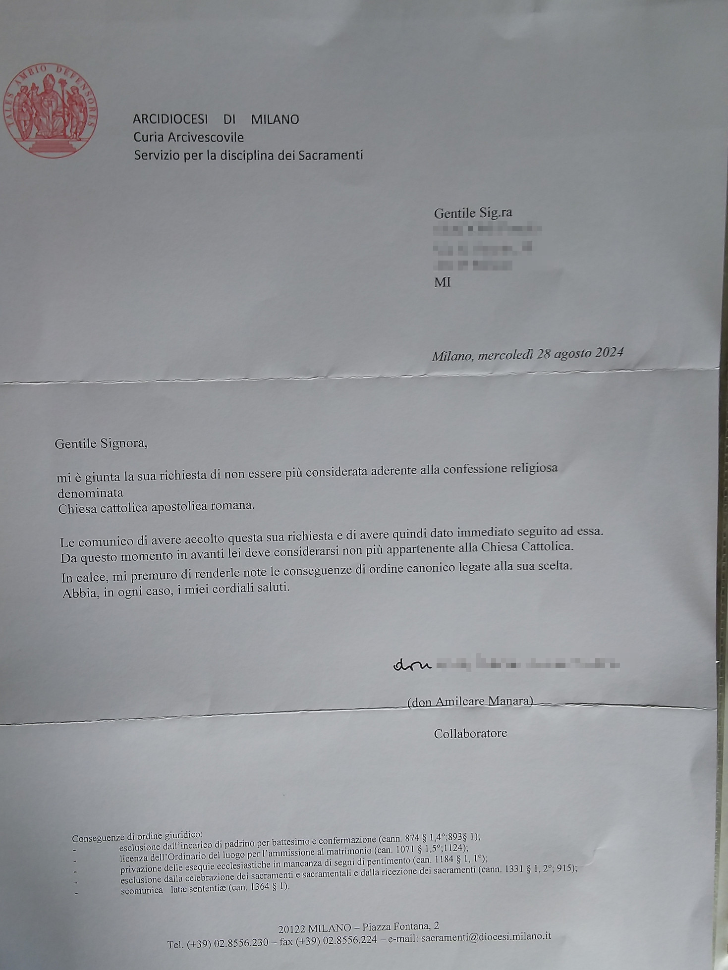Una persona ha chiesto la rettifica dei dati relativi al proprio battesimo avvenuto a S. Andrea Milano - MILANO (MI) il 28/08/2024, dichiarando di non voler più far parte della Chiesa Cattolica.