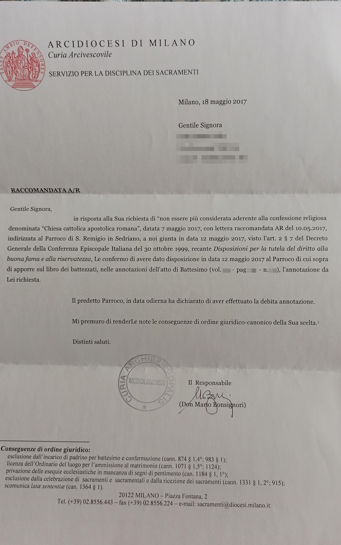 Una persona ha chiesto la rettifica dei dati relativi al proprio battesimo avvenuto a S. Remigio - SEDRIANO (MI) il 18/05/2017, dichiarando di non voler più far parte della Chiesa Cattolica.