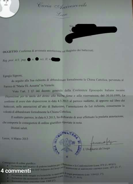 Una persona ha chiesto la rettifica dei dati relativi al proprio battesimo avvenuto a Maria Ss. Assunta - VERNOLE (LE) il 06/03/2013, dichiarando di non voler più far parte della Chiesa Cattolica.