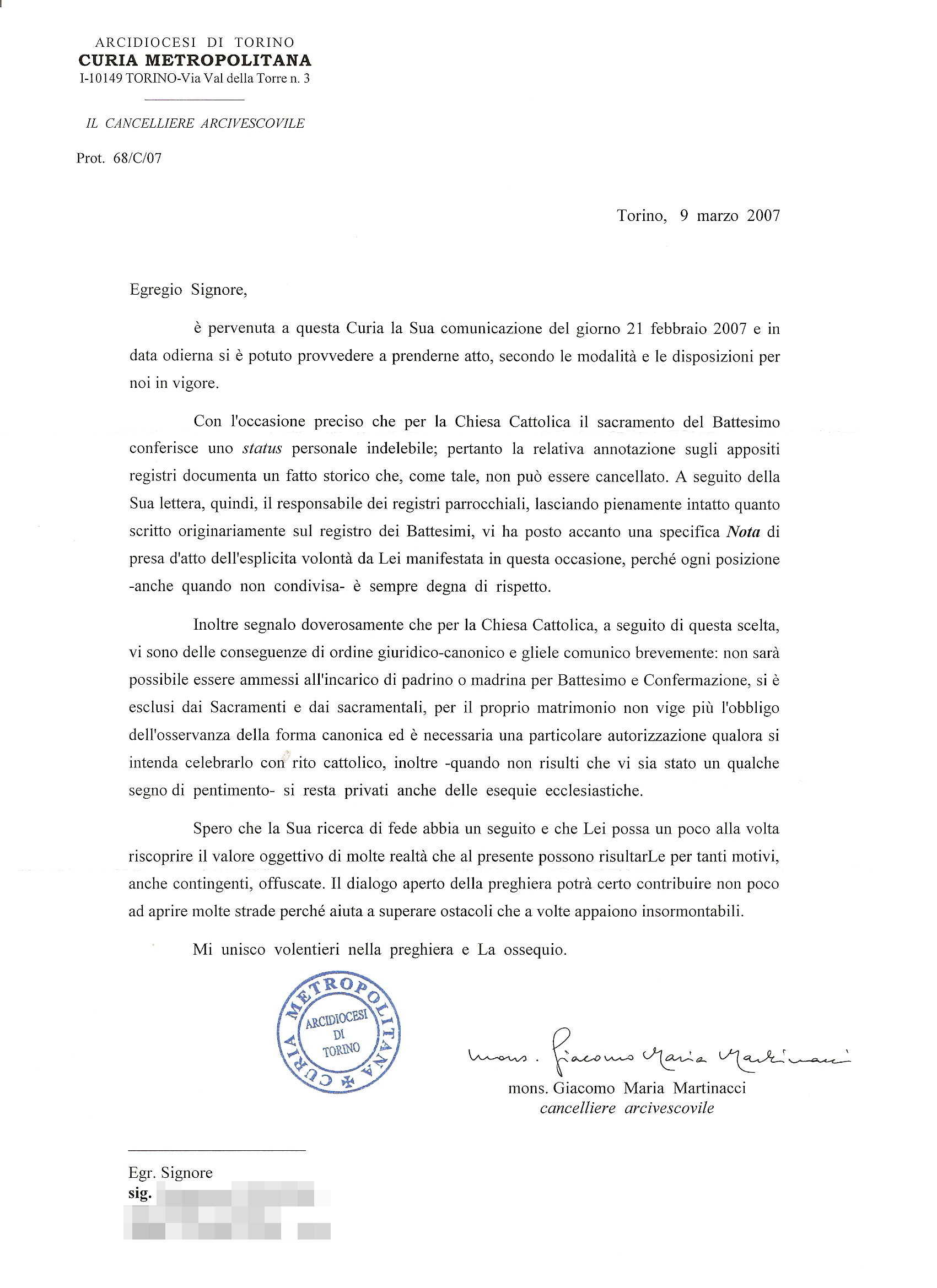 Una persona ha chiesto la rettifica dei dati relativi al proprio battesimo avvenuto a Santo Volto - TORINO (TO) il 09/03/2007, dichiarando di non voler più far parte della Chiesa Cattolica.