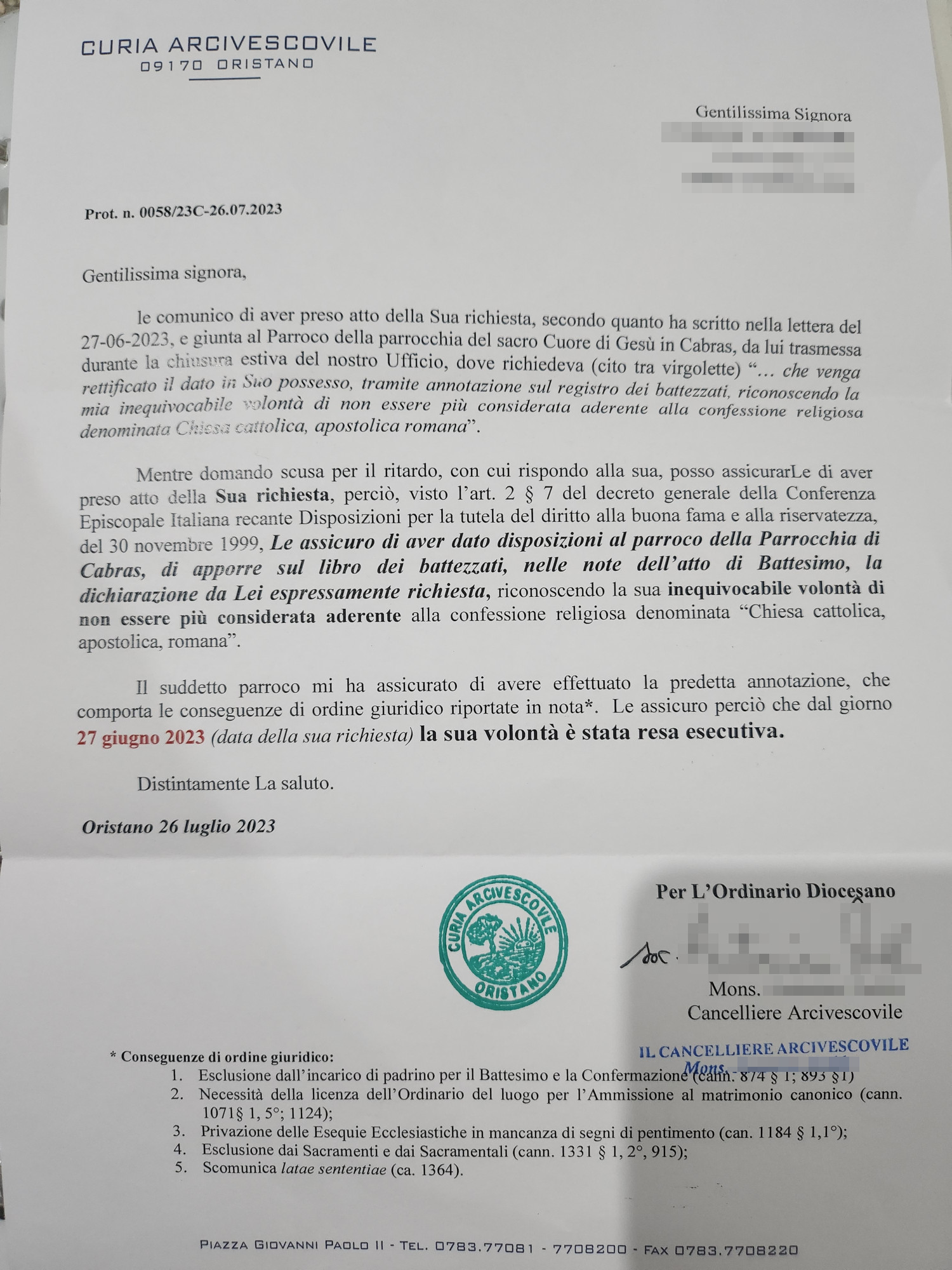 Una persona ha chiesto la rettifica dei dati relativi al proprio battesimo avvenuto a Sacro Cuore di Gesù - CABRAS (OR) il 26/07/2023, dichiarando di non voler più far parte della Chiesa Cattolica.