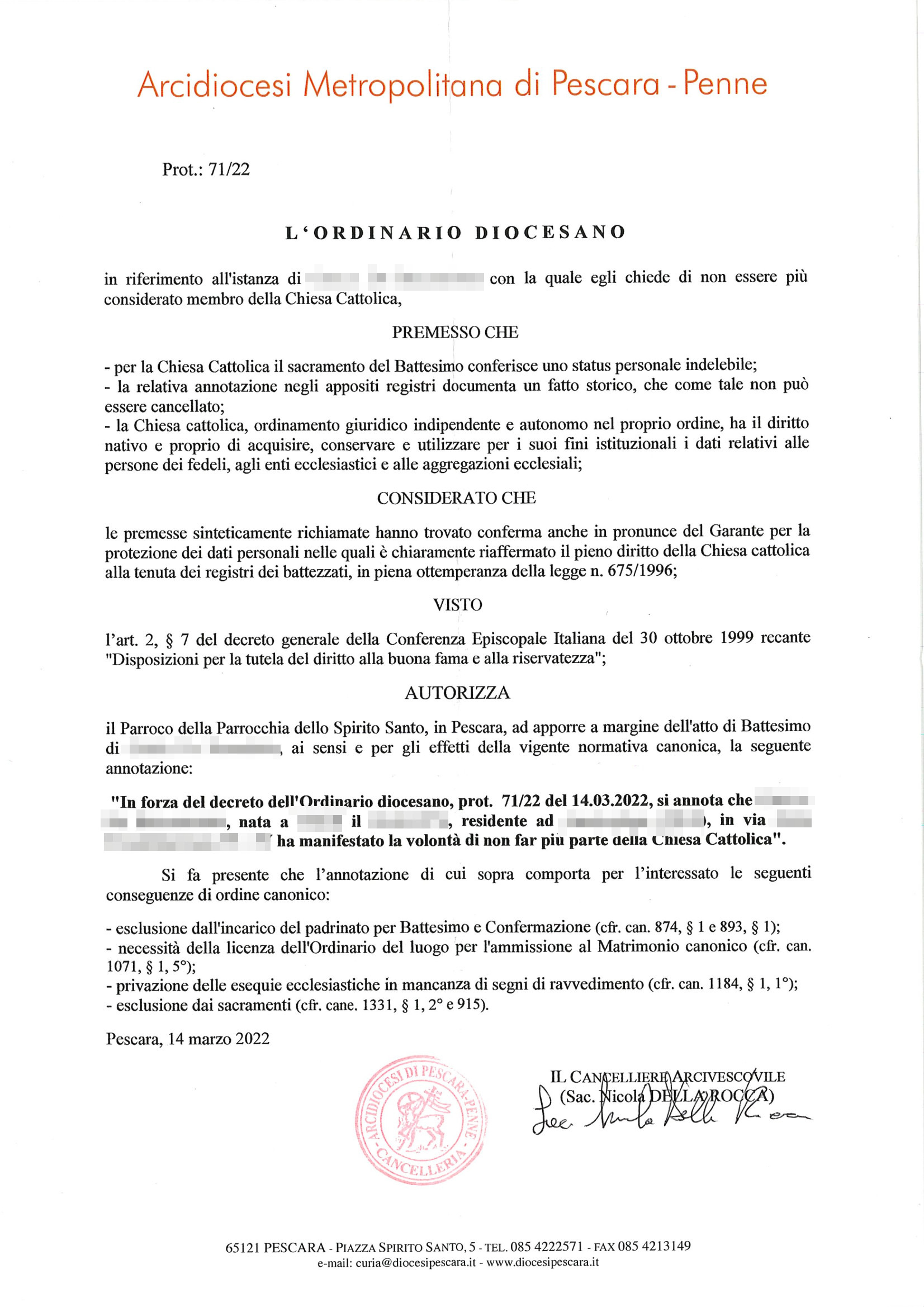 Una persona ha chiesto la rettifica dei dati relativi al proprio battesimo avvenuto a Spirito Santo - PESCARA (PE) il 14/03/2022, dichiarando di non voler più far parte della Chiesa Cattolica.