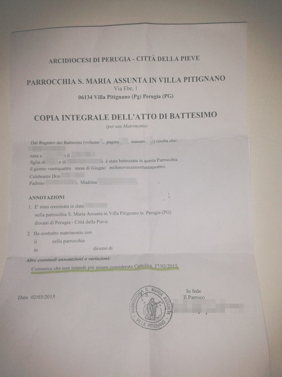 Una persona ha chiesto la rettifica dei dati relativi al proprio battesimo avvenuto a S. Maria Assunta - PERUGIA (PG) il 02/03/2015, dichiarando di non voler più far parte della Chiesa Cattolica.