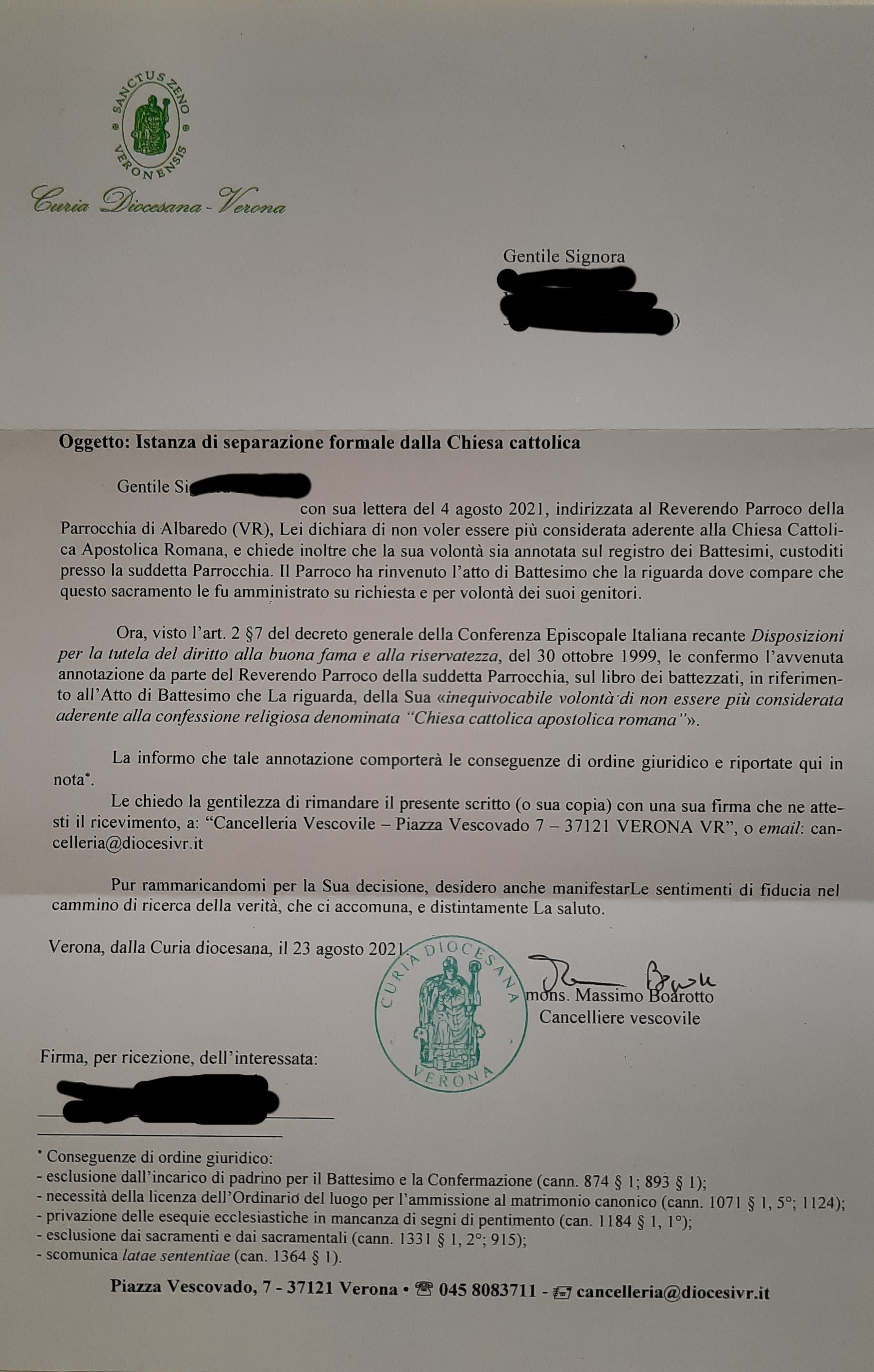 Una persona ha chiesto la rettifica dei dati relativi al proprio battesimo avvenuto a Santa Maria Assunta - ALBAREDO D'ADIGE (VR) il 23/08/2021, dichiarando di non voler più far parte della Chiesa Cattolica.