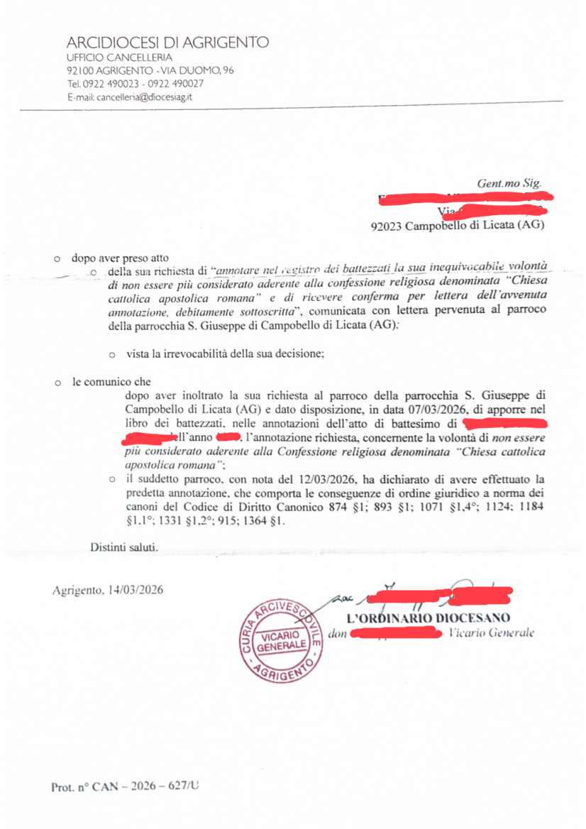 Una persona ha chiesto la rettifica dei dati relativi al proprio battesimo avvenuto a San Giuseppe - CAMPOBELLO DI LICATA (AG) il 18/03/2026, dichiarando di non voler più far parte della Chiesa Cattolica.