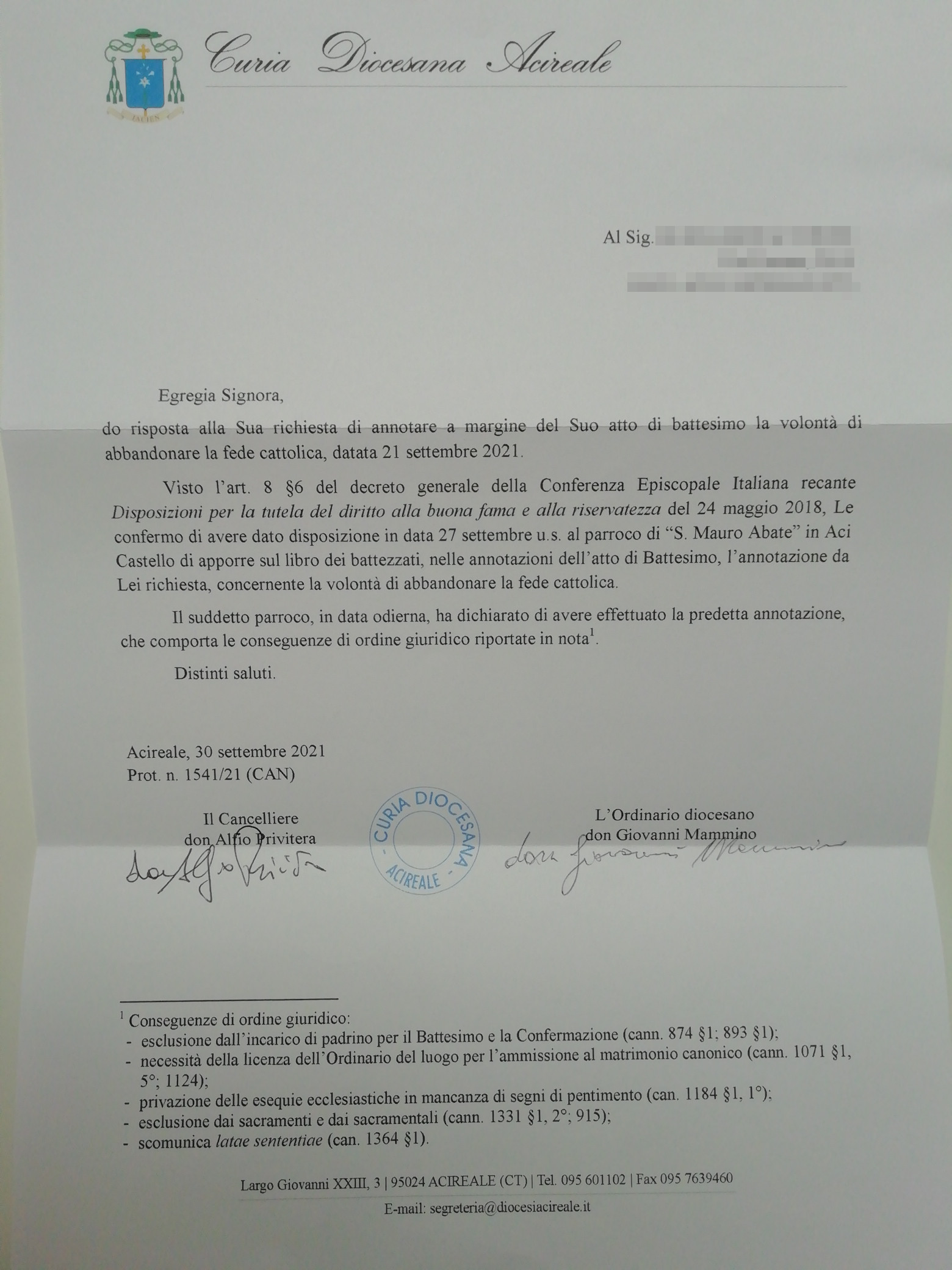 Una persona ha chiesto la rettifica dei dati relativi al proprio battesimo avvenuto a S. Mauro Abate - ACI CASTELLO (CT) il 04/10/2021, dichiarando di non voler più far parte della Chiesa Cattolica.