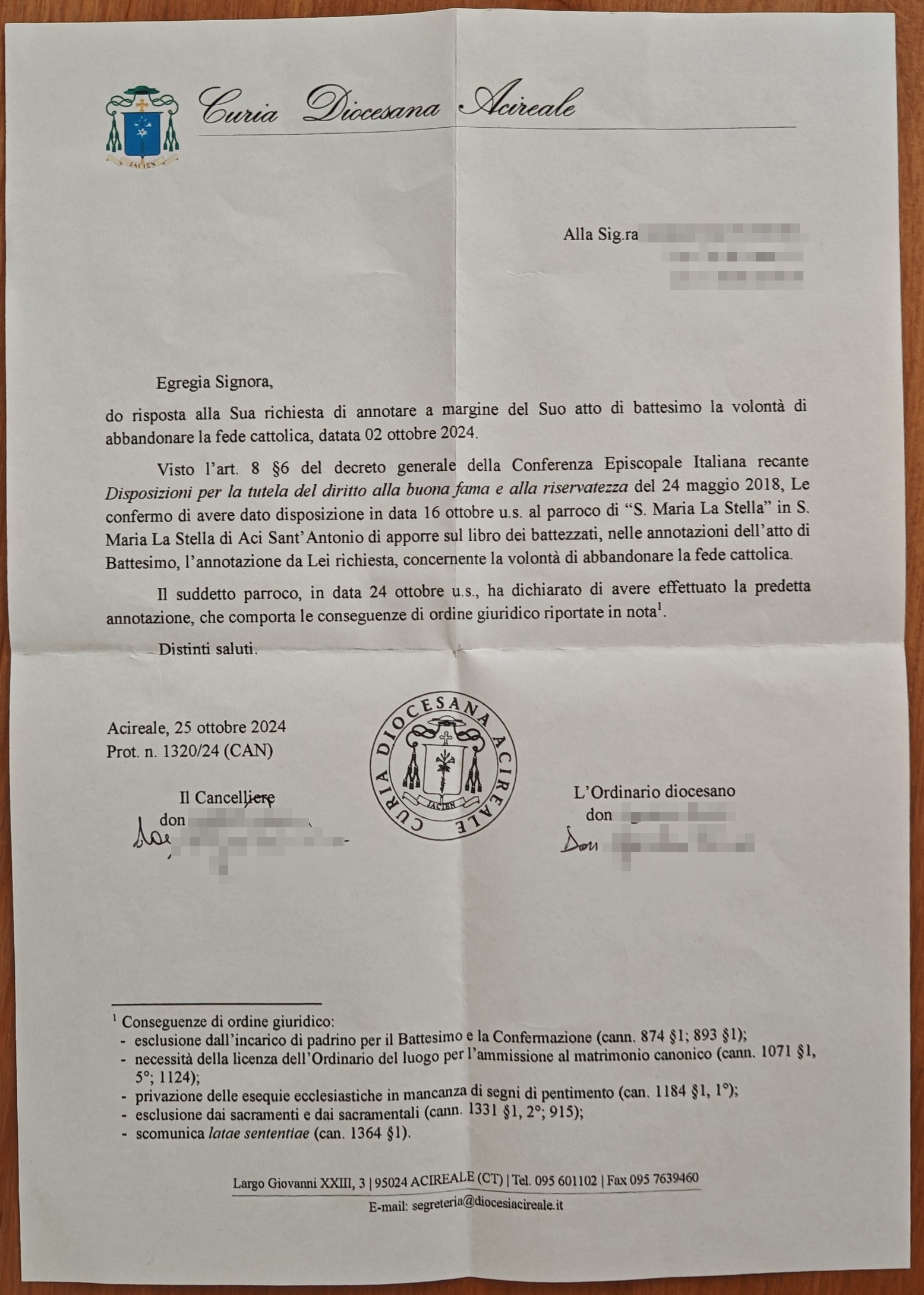 Una persona ha chiesto la rettifica dei dati relativi al proprio battesimo avvenuto a S. Maria La Stella - ACI SANT'ANTONIO (CT) il 25/10/2024, dichiarando di non voler più far parte della Chiesa Cattolica.