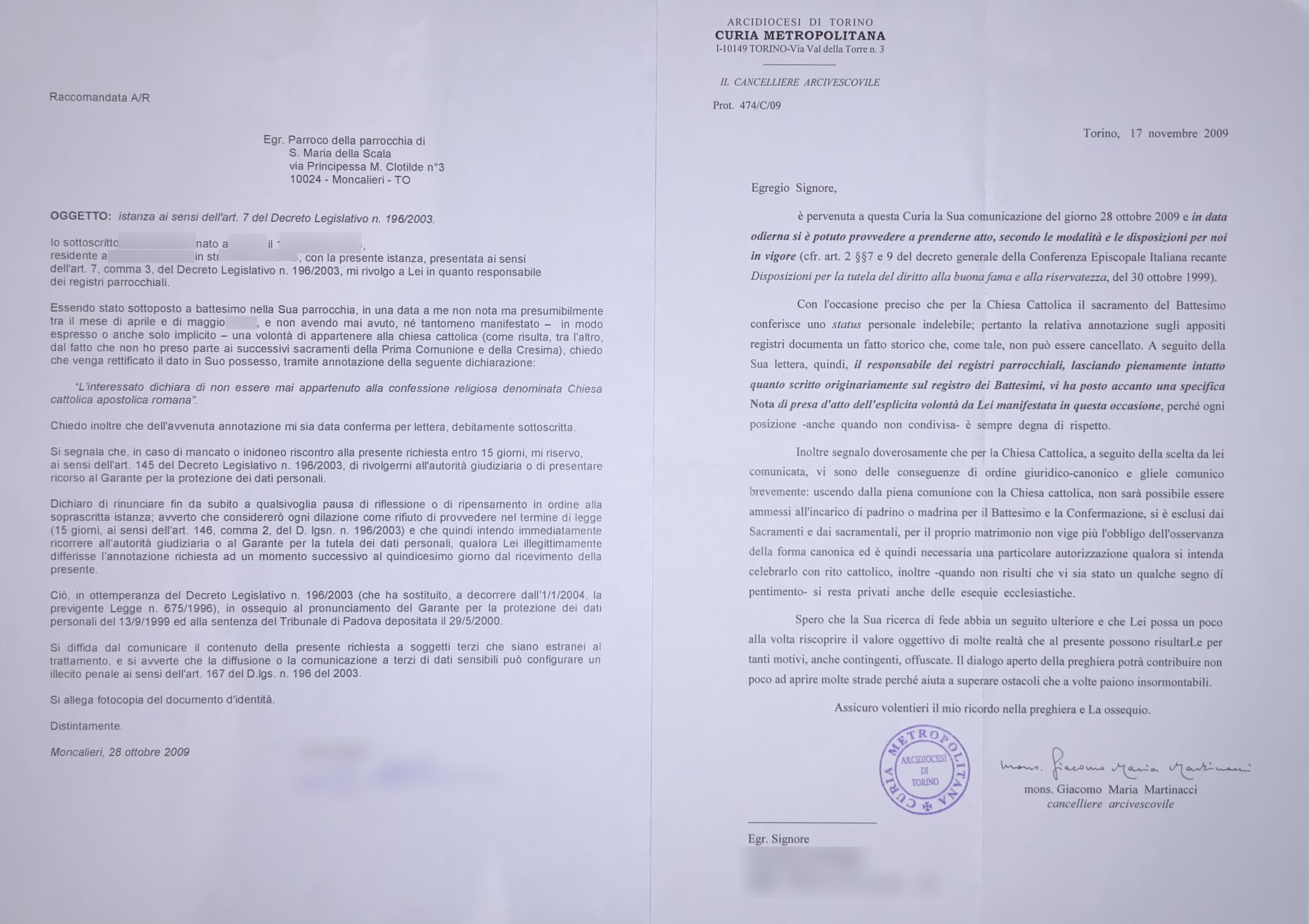 Una persona ha chiesto la rettifica dei dati relativi al proprio battesimo avvenuto a S. Maria della Scala e S. Egidio - MONCALIERI (TO) il 17/11/2009, dichiarando di non voler più far parte della Chiesa Cattolica.
