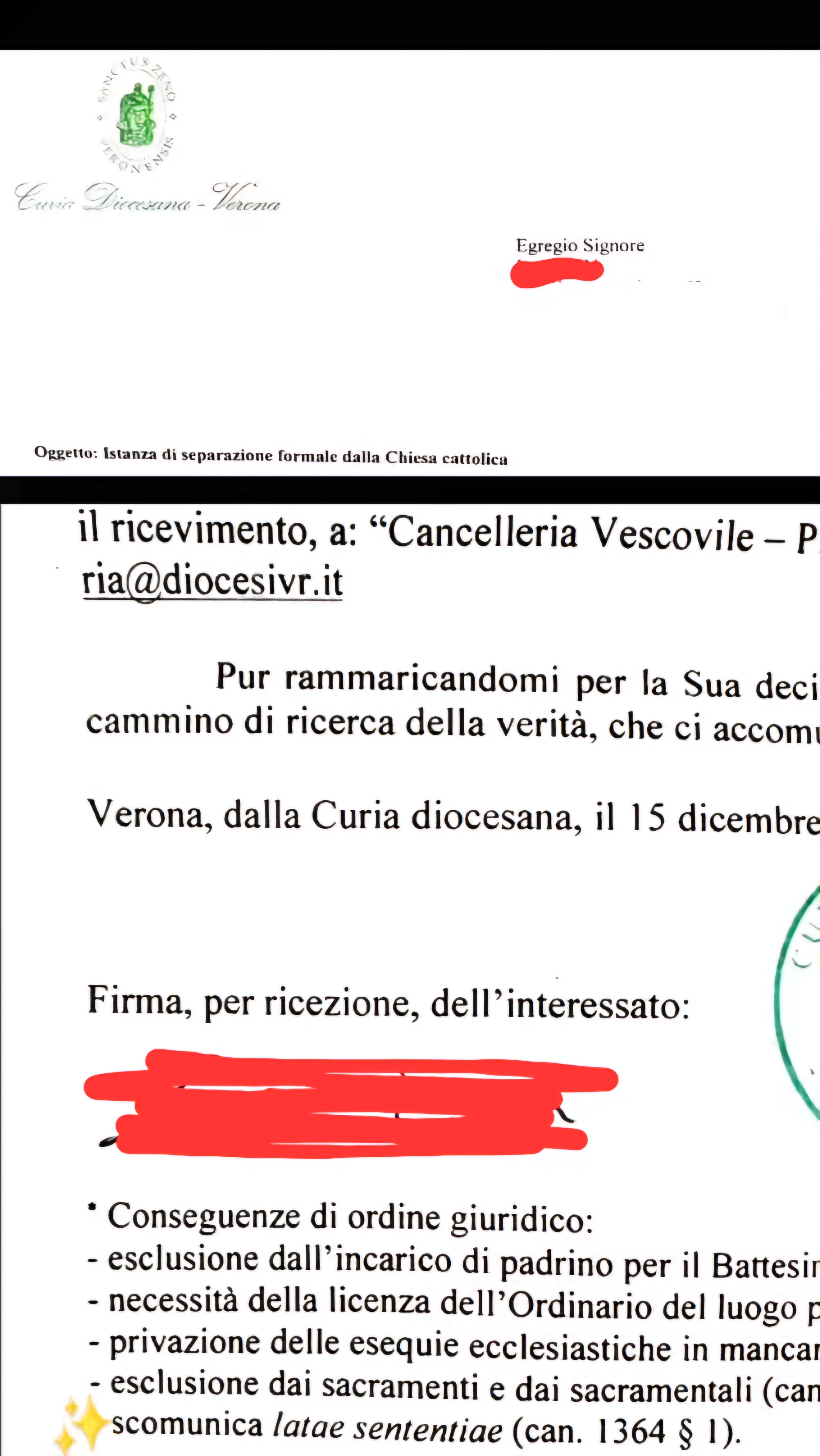 Ho inviato la raccomandata con conferma di recapito, tutto regolare.... Poi più saputo niente per mesi al che ho telefonato in parrocchia, il prete è stato gentilissimo e ha ammesso di non saperne niente quindi ipotizzo che il suo "segretario" avesse buttato via, secondo me perché non la considerasse una cosa seria più che per sincera malafede... Allora ho riscritto e consegnato di persona, stavolta il prete ha svolto tutto regolarmente
