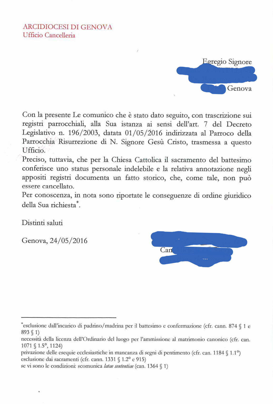 Una persona ha chiesto la rettifica dei dati relativi al proprio battesimo avvenuto a Risurrezione di Nostro Signore Gesù Cristo - GENOVA (GE) il 24/05/2016, dichiarando di non voler più far parte della Chiesa Cattolica.