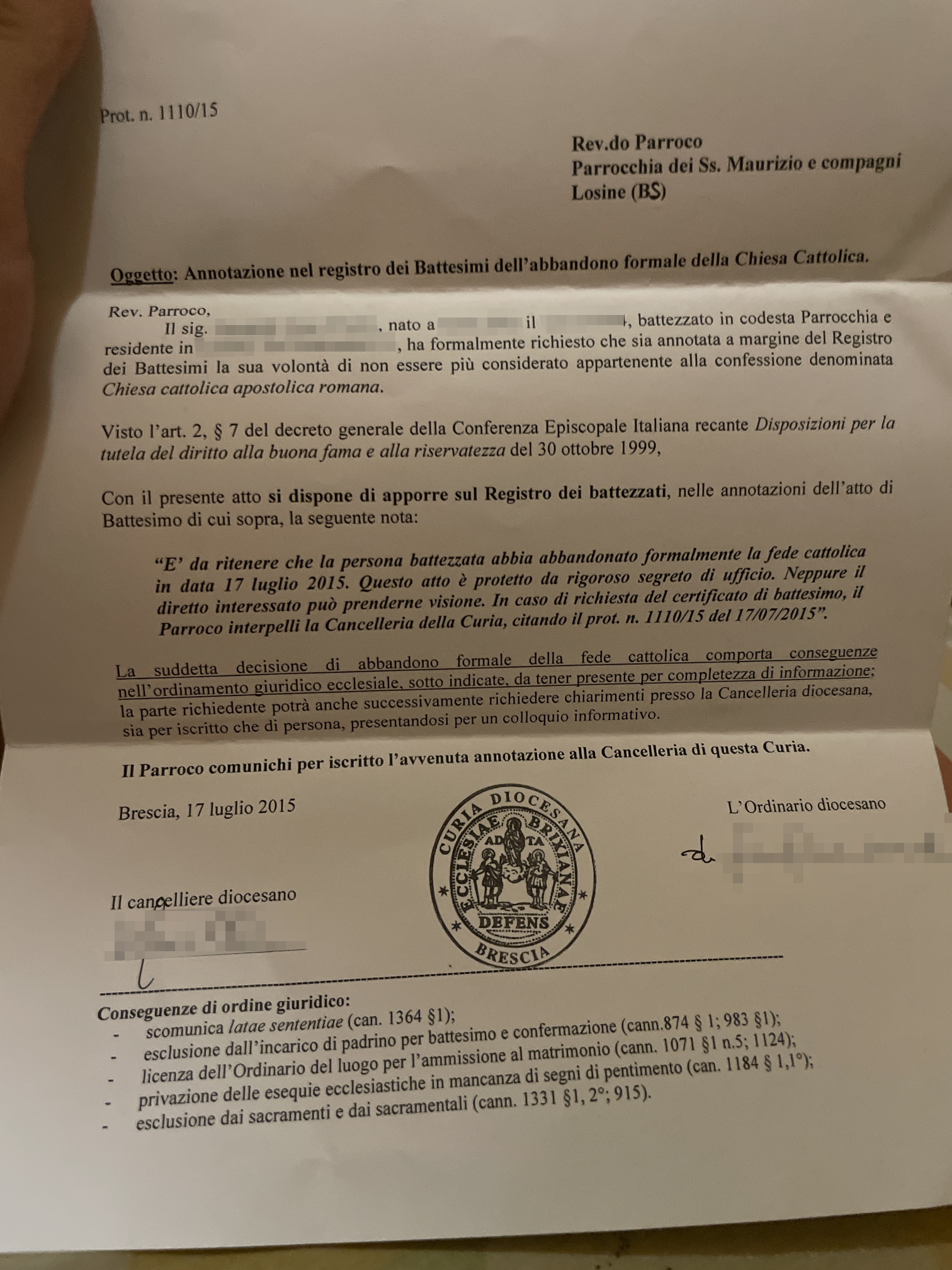 Una persona ha chiesto la rettifica dei dati relativi al proprio battesimo avvenuto a Santi Maurizio e Compagni - LOSINE (BS) il 24/07/2015, dichiarando di non voler più far parte della Chiesa Cattolica.