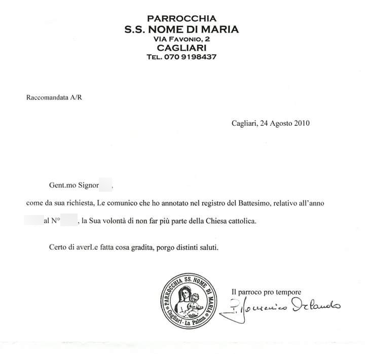 Una persona ha chiesto la rettifica dei dati relativi al proprio battesimo avvenuto a Ss. Nome di Maria - CAGLIARI (CA) il 24/08/2010, dichiarando di non voler più far parte della Chiesa Cattolica.