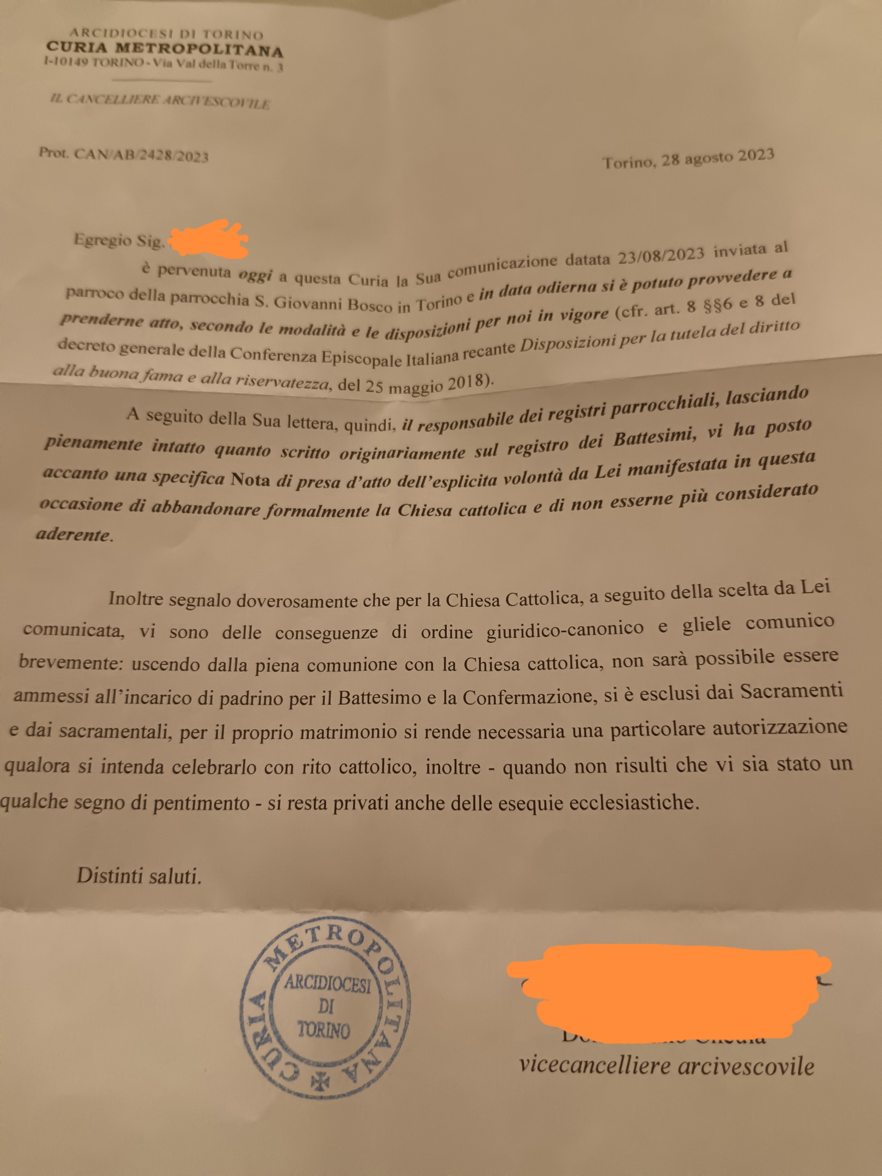 Una persona ha chiesto la rettifica dei dati relativi al proprio battesimo avvenuto a S. Giovanni Bosco - TORINO (TO) il 28/08/2023, dichiarando di non voler più far parte della Chiesa Cattolica.