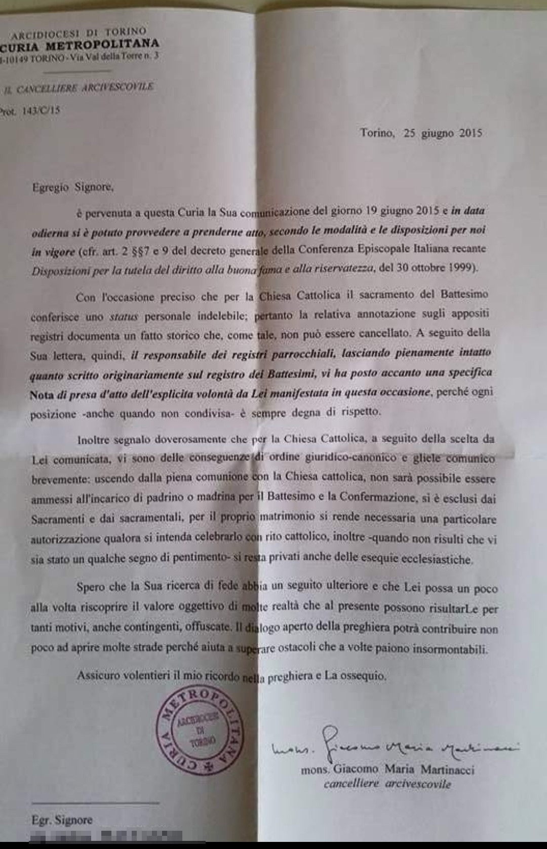 Una persona ha chiesto la rettifica dei dati relativi al proprio battesimo avvenuto a Immacolata Concezione e S. Donato - TORINO (TO) il 25/06/2015, dichiarando di non voler più far parte della Chiesa Cattolica.