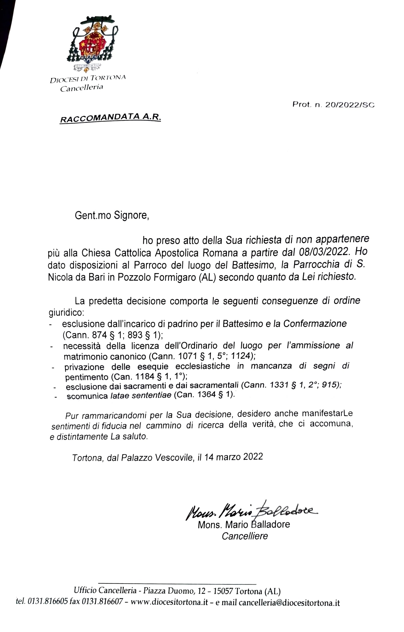 Una persona ha chiesto la rettifica dei dati relativi al proprio battesimo avvenuto a S. Nicola da Bari - POZZOLO FORMIGARO (AL) il 14/03/2022, dichiarando di non voler più far parte della Chiesa Cattolica.