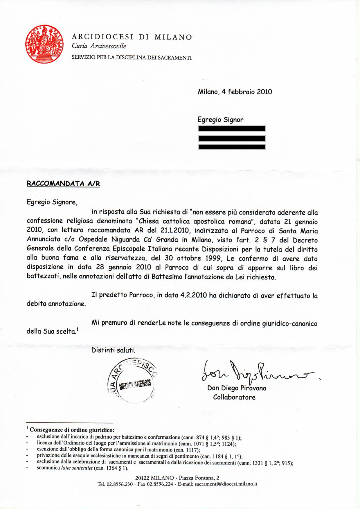 Una persona ha chiesto la rettifica dei dati relativi al proprio battesimo avvenuto a Santa Maria Annunciata - MILANO (MI) il 04/02/2010, dichiarando di non voler più far parte della Chiesa Cattolica.