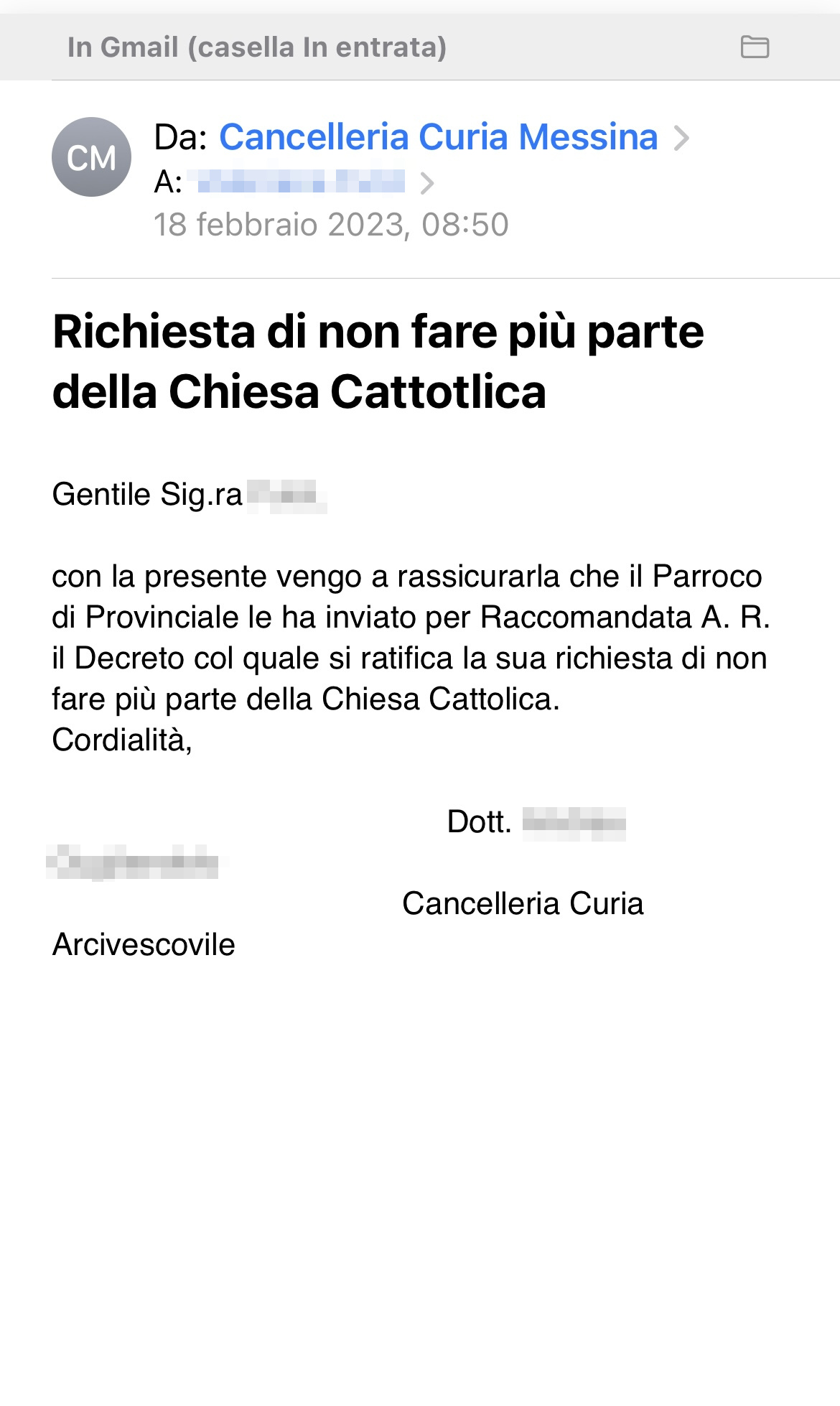 Una persona ha chiesto la rettifica dei dati relativi al proprio battesimo avvenuto a S. Maria di Gesù - MESSINA (ME) il 18/02/2023, dichiarando di non voler più far parte della Chiesa Cattolica.