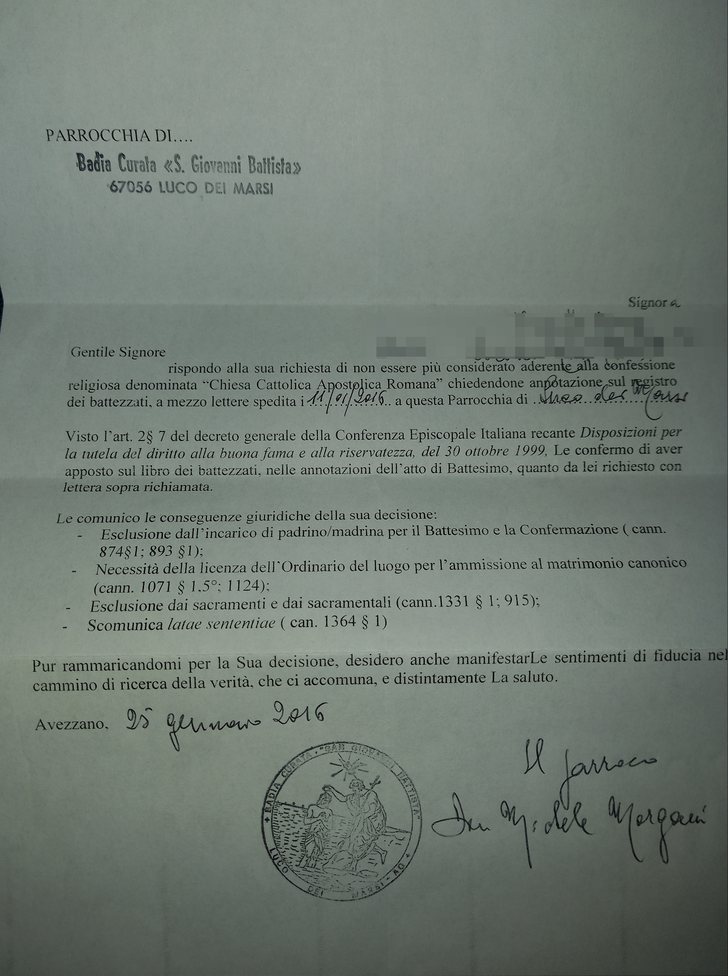 Una persona ha chiesto la rettifica dei dati relativi al proprio battesimo avvenuto a San Giovanni Battista - LUCO DEI MARSI (AQ) il 25/01/2016, dichiarando di non voler più far parte della Chiesa Cattolica.