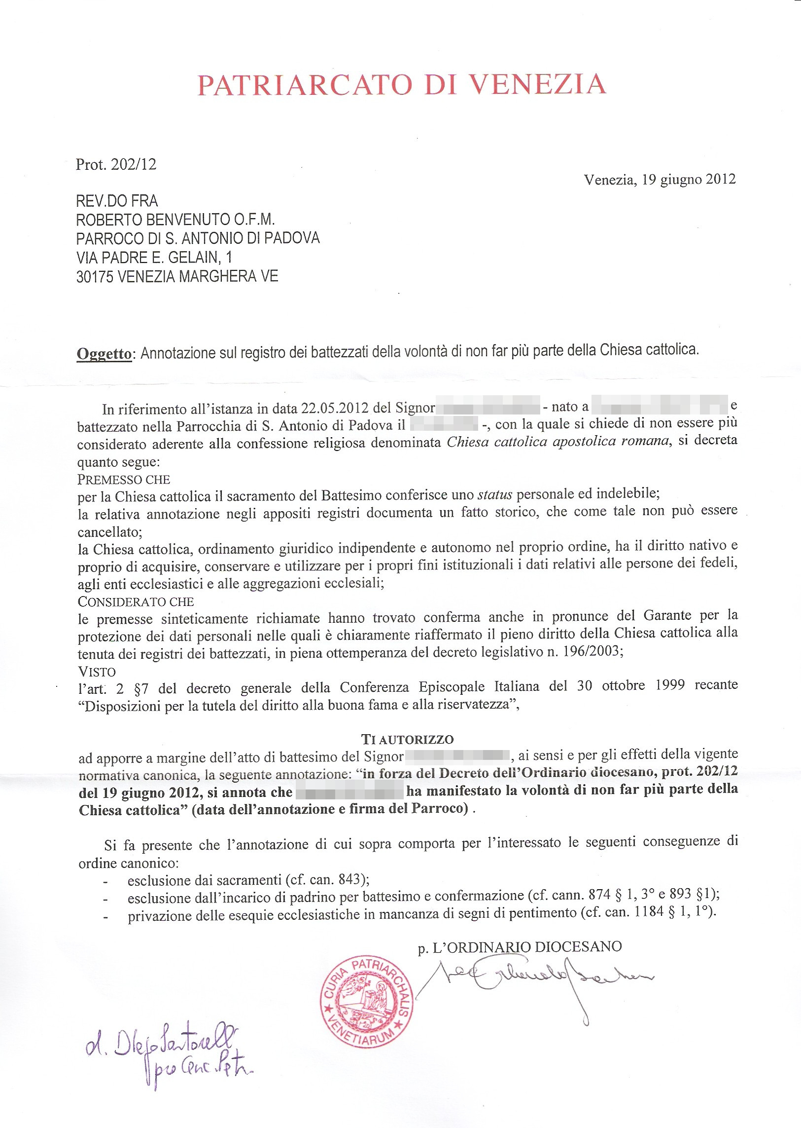 Una persona ha chiesto la rettifica dei dati relativi al proprio battesimo avvenuto a Sant'Antonio di Padova - VENEZIA (VE) il 19/06/2012, dichiarando di non voler più far parte della Chiesa Cattolica.