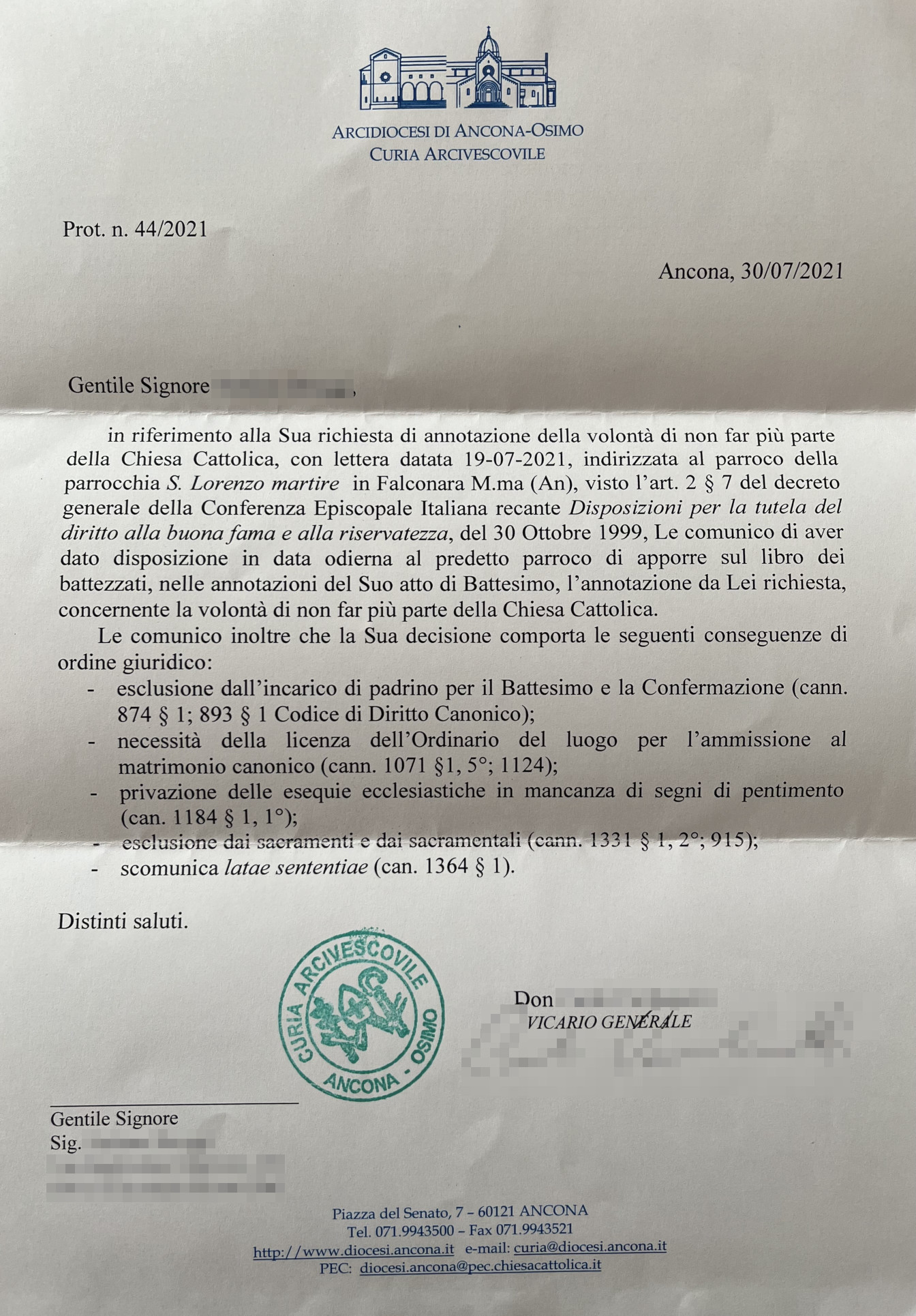 Una persona ha chiesto la rettifica dei dati relativi al proprio battesimo avvenuto a S. Lorenzo - FALCONARA MARITTIMA (AN) il 30/07/2021, dichiarando di non voler più far parte della Chiesa Cattolica.