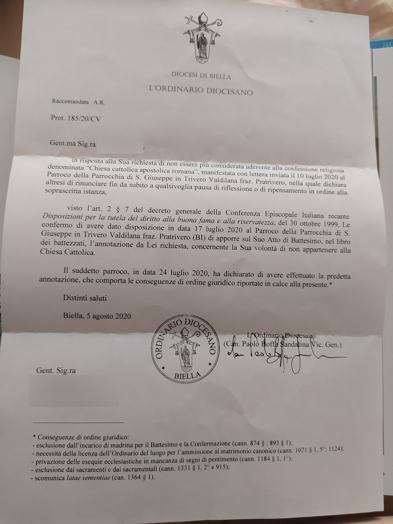 Una persona ha chiesto la rettifica dei dati relativi al proprio battesimo avvenuto a San Giuseppe - TRIVERO (BI) il 05/08/2020, dichiarando di non voler più far parte della Chiesa Cattolica.
