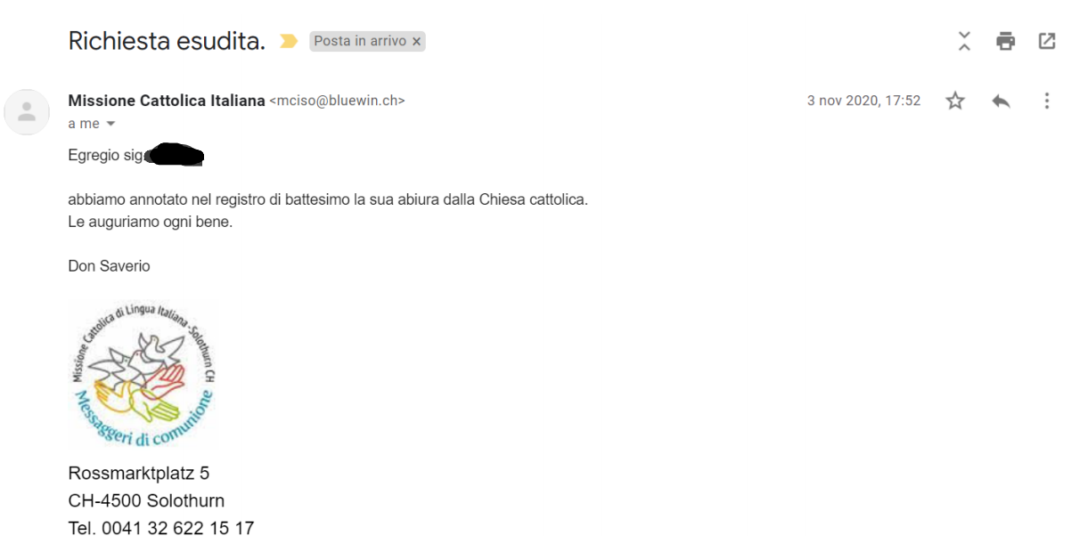Una persona ha chiesto la rettifica dei dati relativi al proprio battesimo avvenuto a Sant'Eusebio - GRENCHEN, CH il 03/11/2020, dichiarando di non voler più far parte della Chiesa Cattolica.