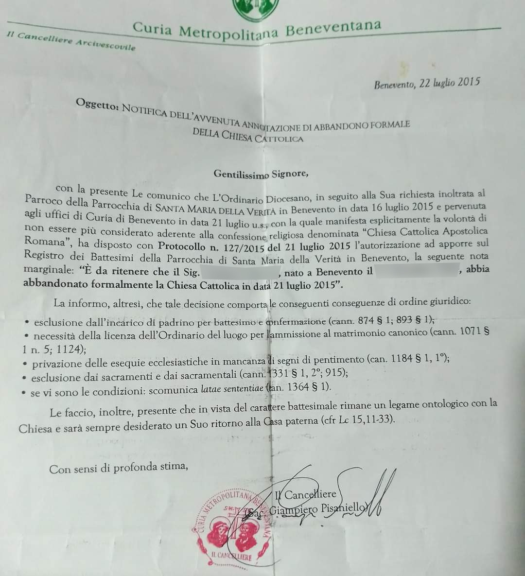 Una persona ha chiesto la rettifica dei dati relativi al proprio battesimo avvenuto a S. Maria della Verità - BENEVENTO (BN) il 16/06/2021, dichiarando di non voler più far parte della Chiesa Cattolica.