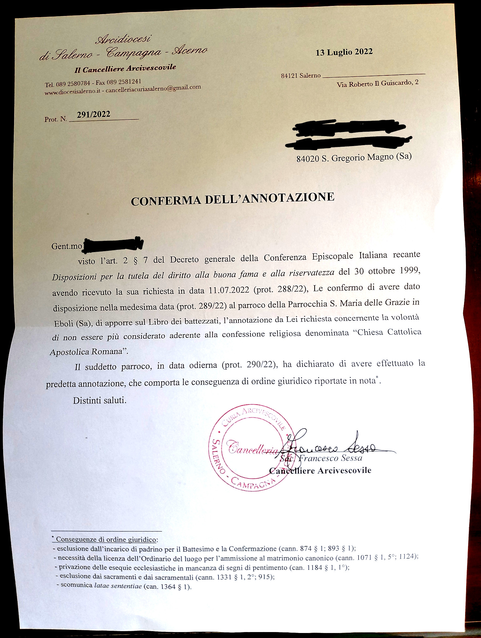 Una persona ha chiesto la rettifica dei dati relativi al proprio battesimo avvenuto a S. Maria delle Grazie - EBOLI (SA) il 13/07/2022, dichiarando di non voler più far parte della Chiesa Cattolica.