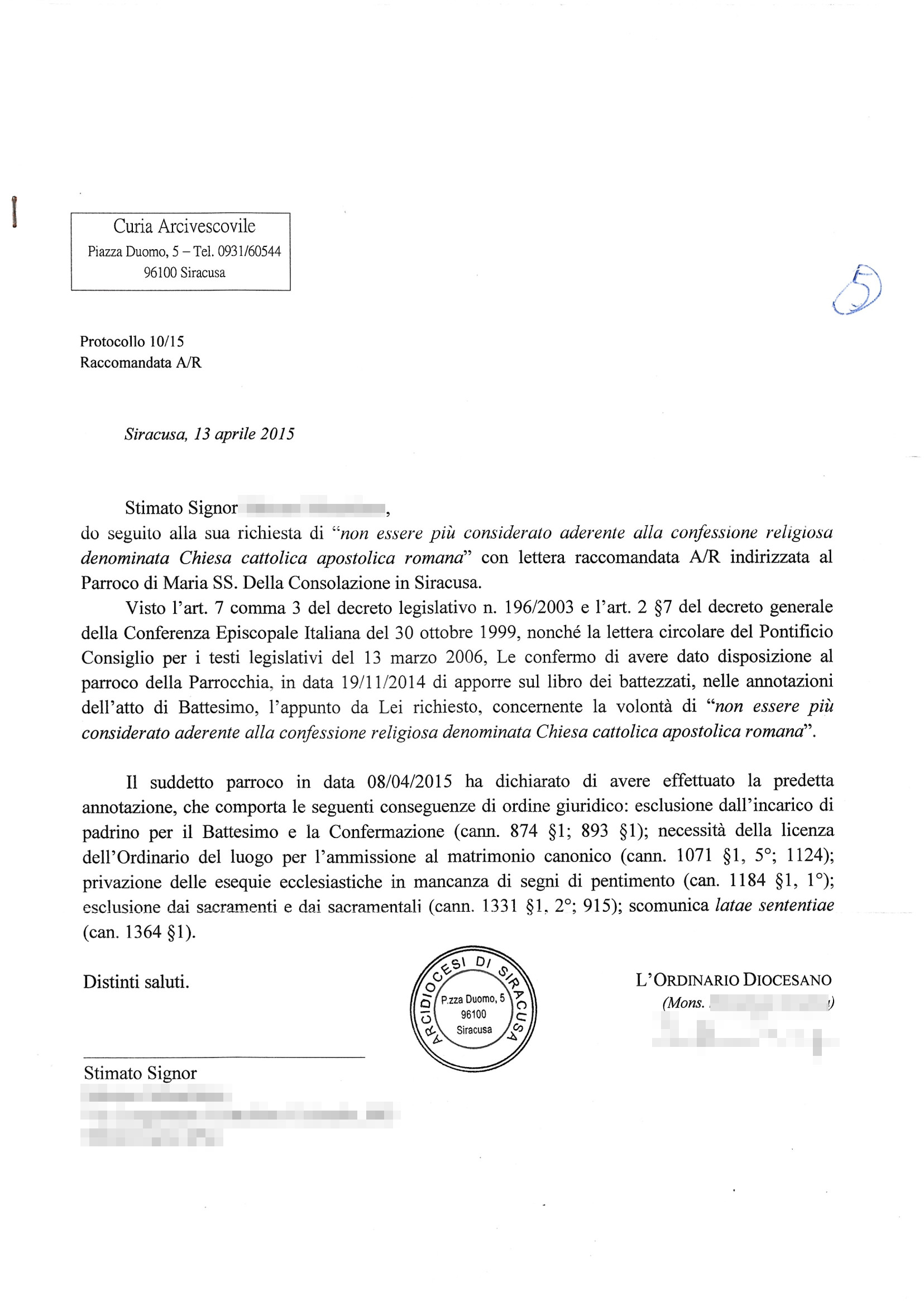 Una persona ha chiesto la rettifica dei dati relativi al proprio battesimo avvenuto a S. Maria della Consolazione - SIRACUSA (SR) il 08/09/2015, dichiarando di non voler più far parte della Chiesa Cattolica.