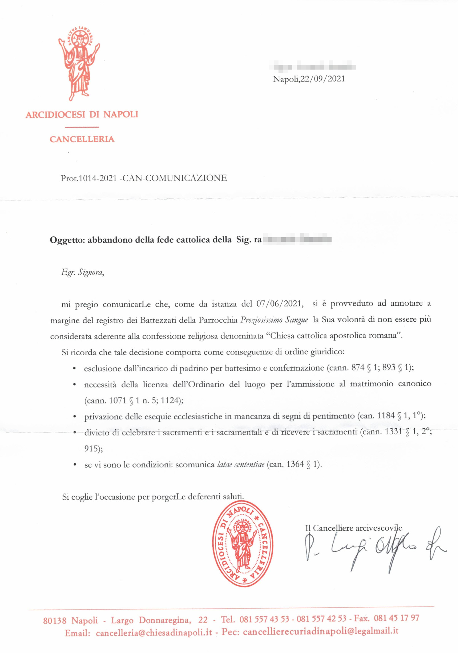 Una persona ha chiesto la rettifica dei dati relativi al proprio battesimo avvenuto a Preziosissimo Sangue - TORRE DEL GRECO (NA) il 24/09/2021, dichiarando di non voler più far parte della Chiesa Cattolica.