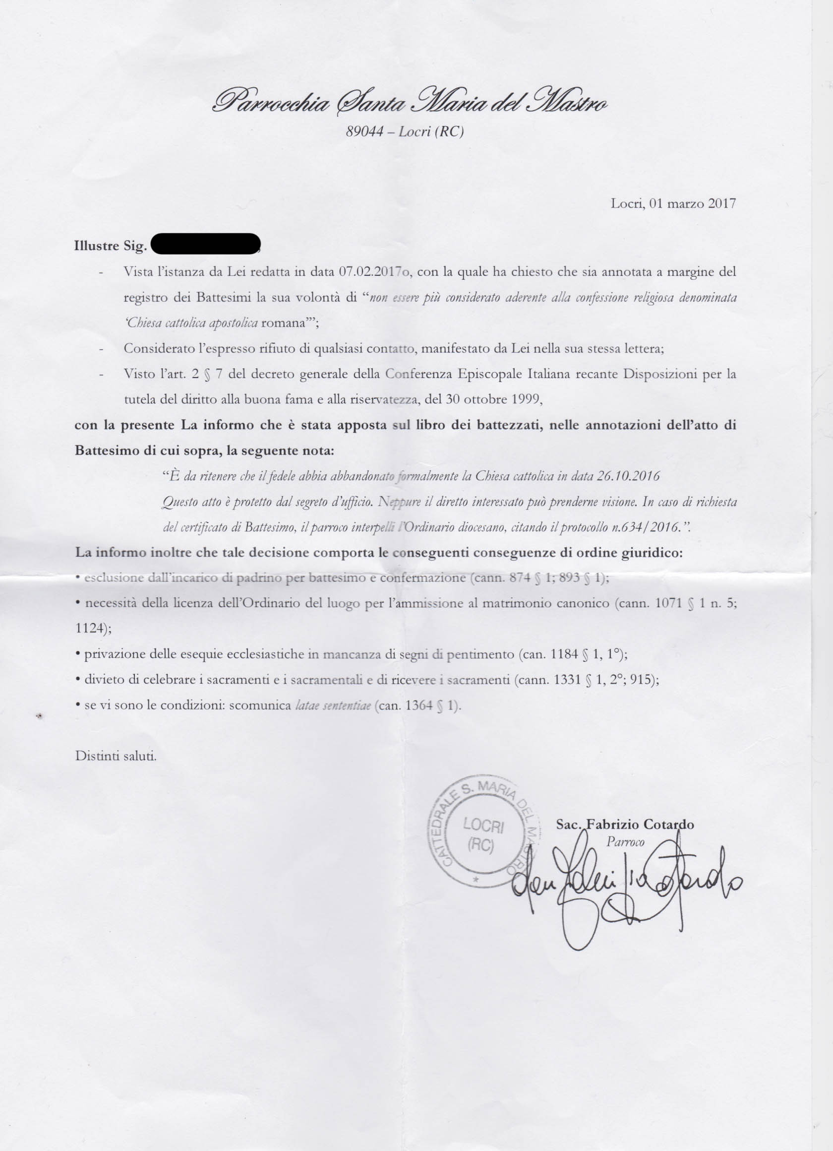 Una persona ha chiesto la rettifica dei dati relativi al proprio battesimo avvenuto a S. Maria del Mastro - LOCRI (RC) il 01/03/2017, dichiarando di non voler più far parte della Chiesa Cattolica.