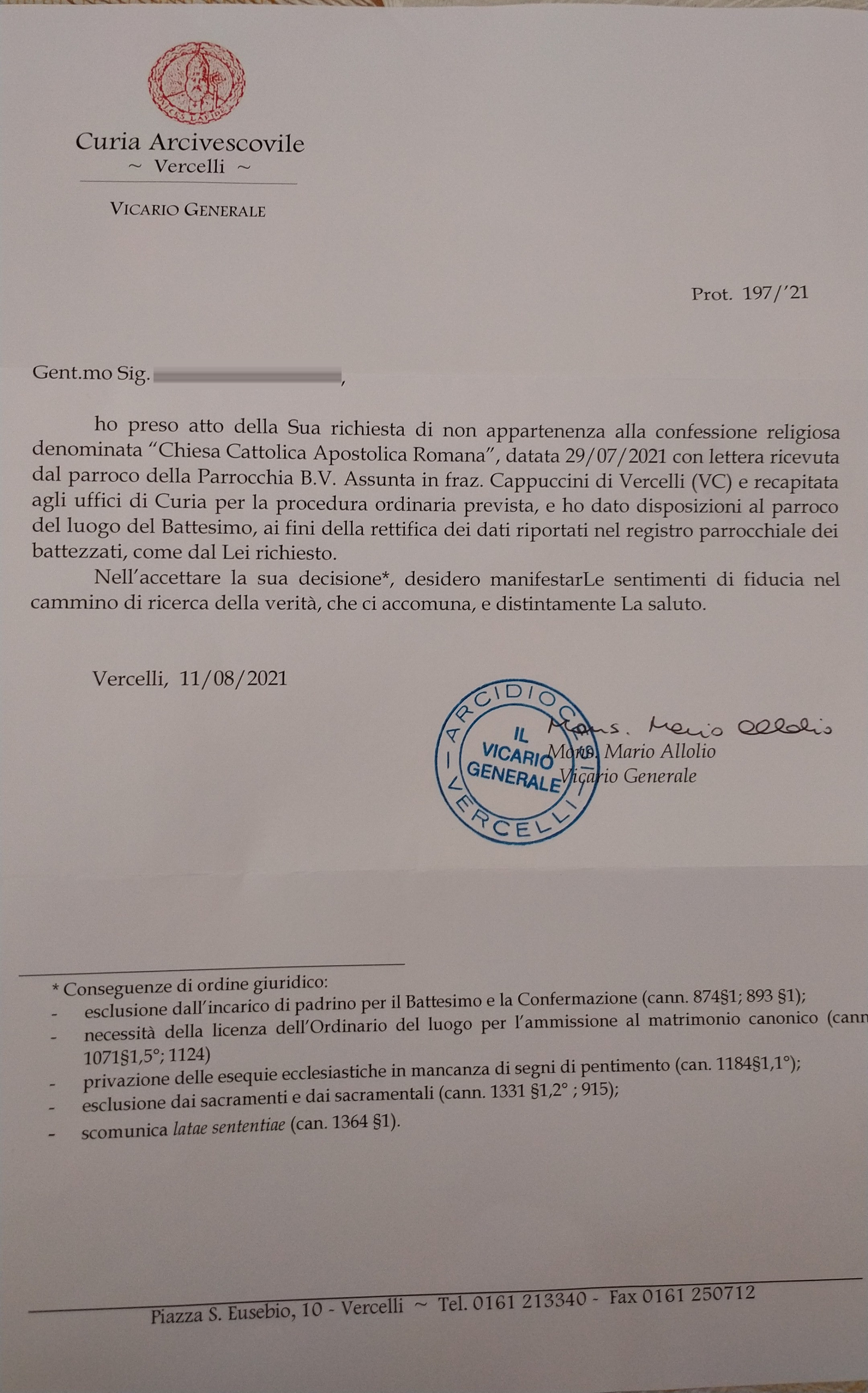 Una persona ha chiesto la rettifica dei dati relativi al proprio battesimo avvenuto a Beata Vergine Assunta - VERCELLI (VC) il 16/08/2021, dichiarando di non voler più far parte della Chiesa Cattolica.