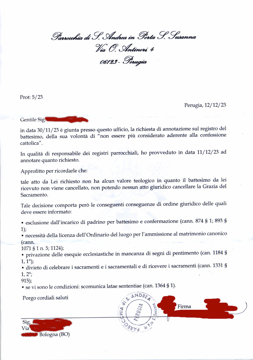 Una persona ha chiesto la rettifica dei dati relativi al proprio battesimo avvenuto a S. Andrea in Porta S. Susanna - PERUGIA (PG) il 12/12/2023, dichiarando di non voler più far parte della Chiesa Cattolica.
