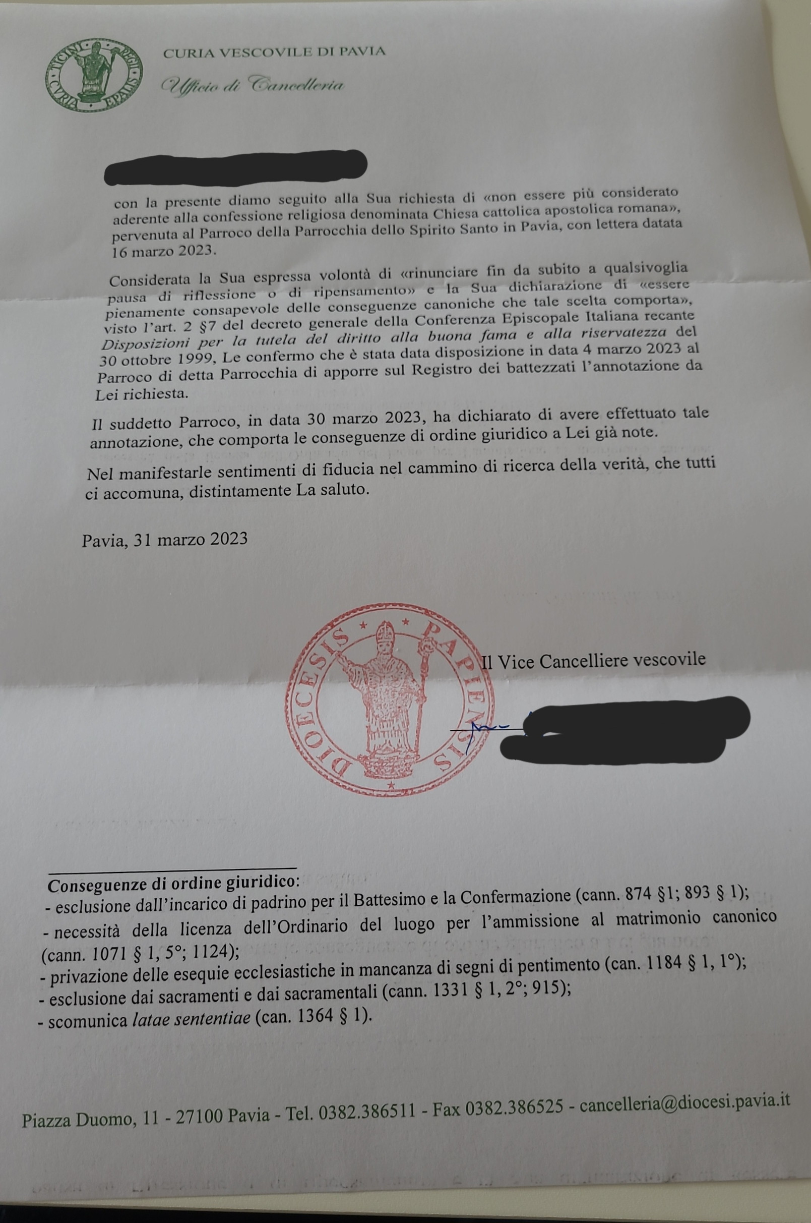 Una persona ha chiesto la rettifica dei dati relativi al proprio battesimo avvenuto a Spirito Santo - PAVIA (PV) il 20/04/2023, dichiarando di non voler più far parte della Chiesa Cattolica.