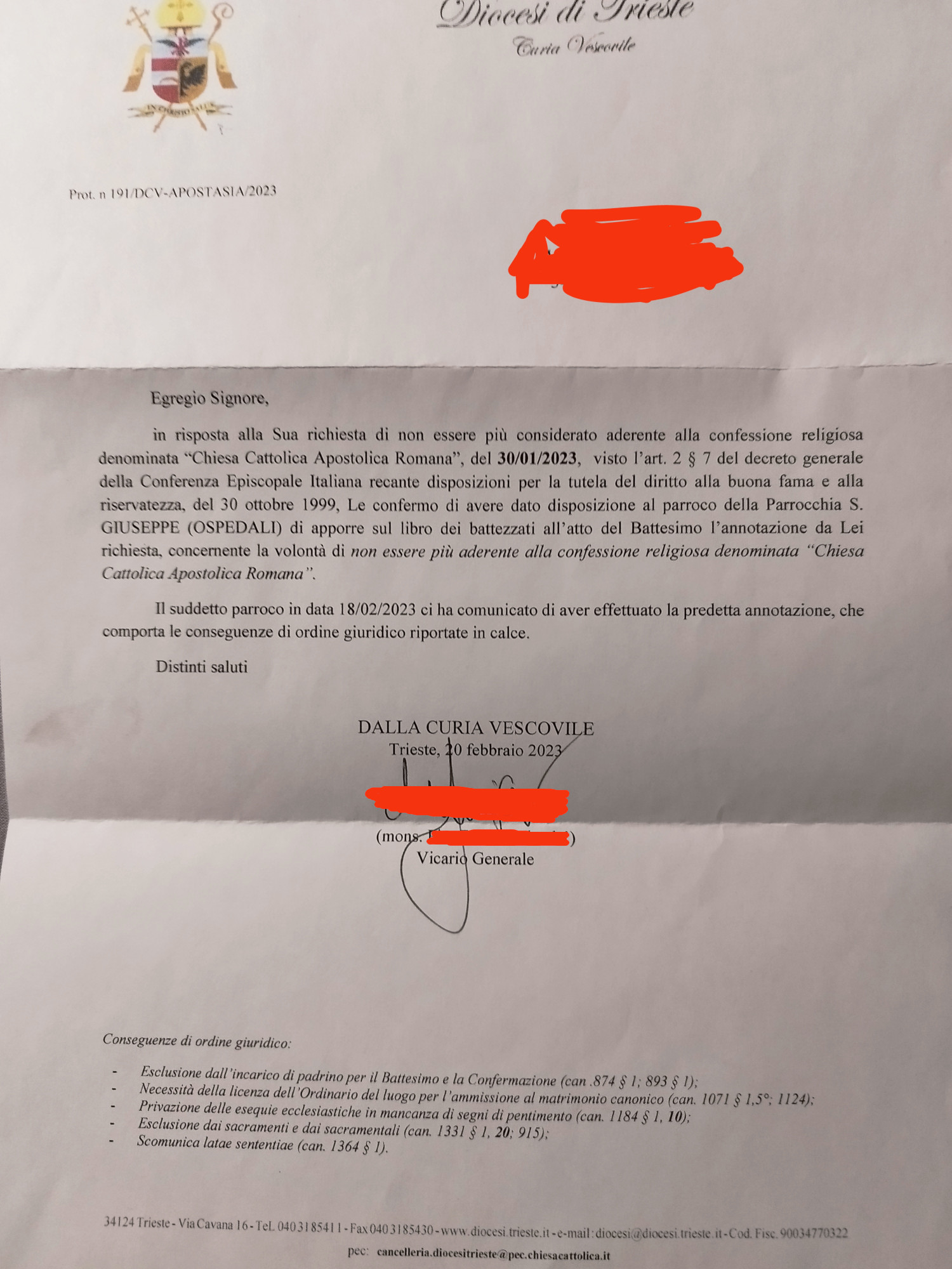 Una persona ha chiesto la rettifica dei dati relativi al proprio battesimo avvenuto a San Giuseppe - TRIESTE (TS) il 18/02/2023, dichiarando di non voler più far parte della Chiesa Cattolica.
