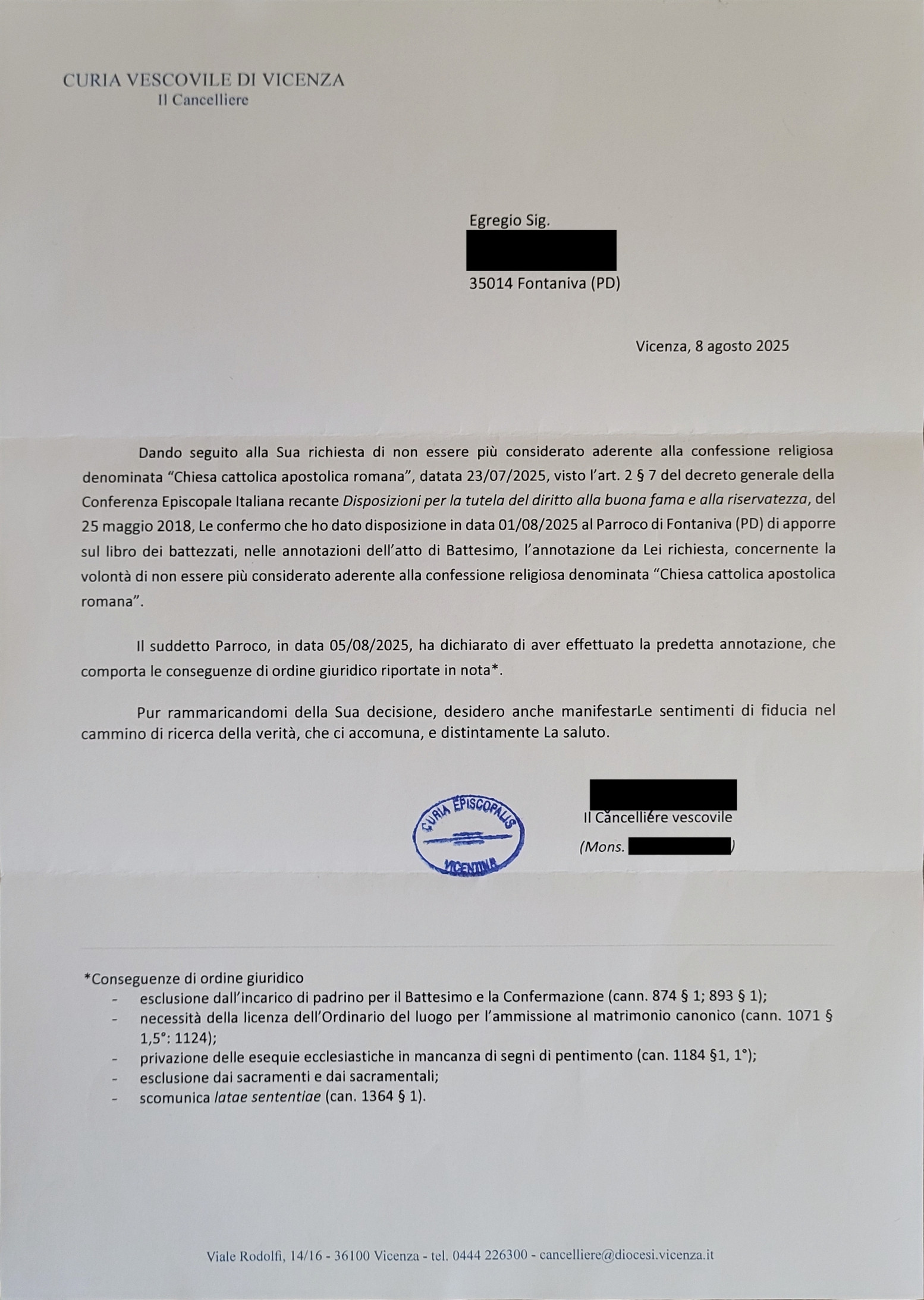 Una persona ha chiesto la rettifica dei dati relativi al proprio battesimo avvenuto a S. Maria e Beato Bertrando - FONTANIVA (PD) il 08/08/2025, dichiarando di non voler più far parte della Chiesa Cattolica.