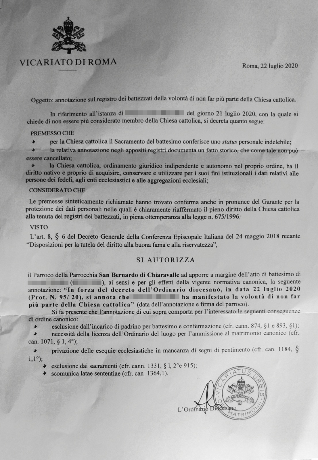 Una persona ha chiesto la rettifica dei dati relativi al proprio battesimo avvenuto a S. Bernardo Da Chiaravalle - ROMA (RM) il 22/07/2020, dichiarando di non voler più far parte della Chiesa Cattolica.