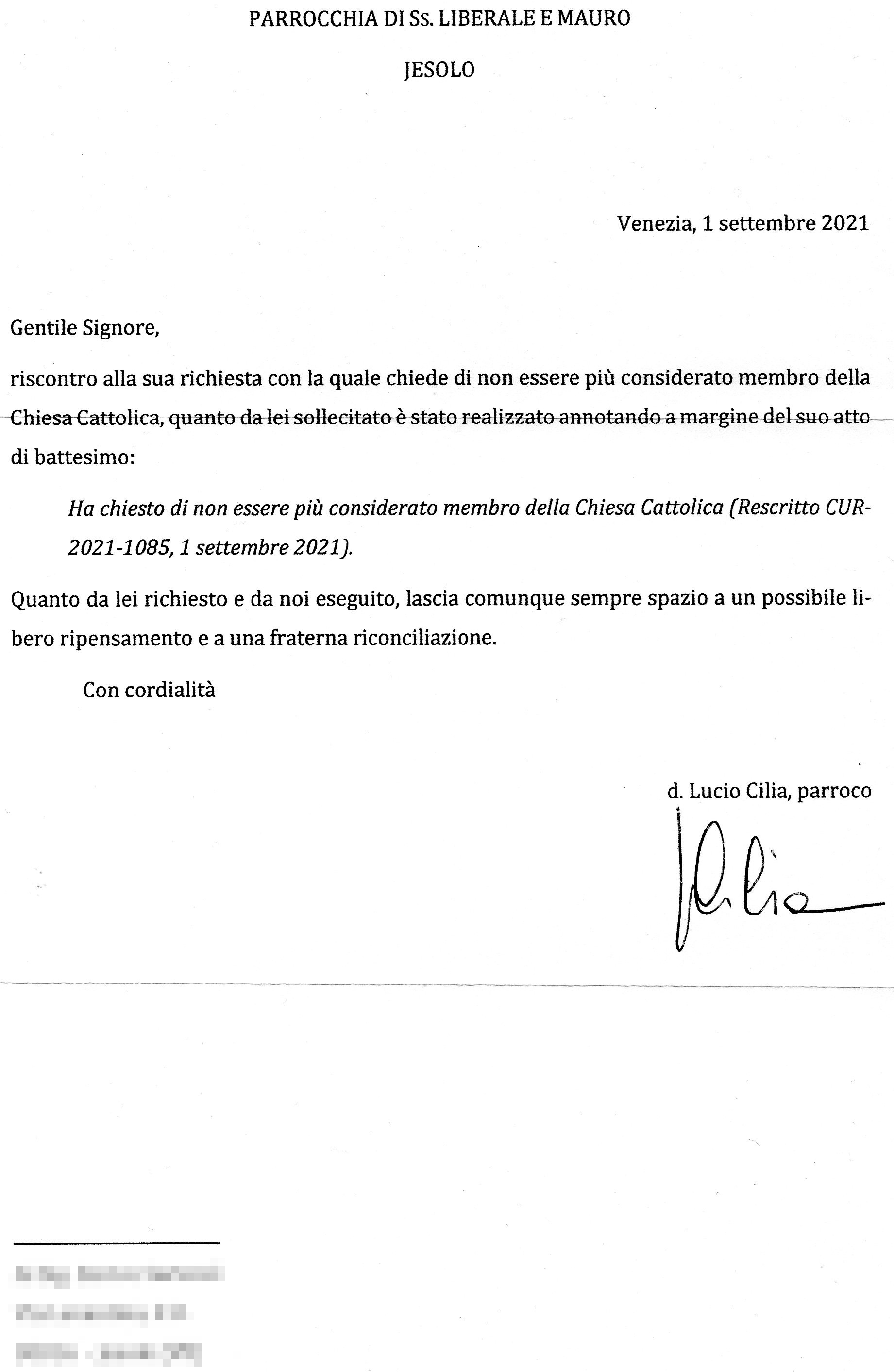Una persona ha chiesto la rettifica dei dati relativi al proprio battesimo avvenuto a Santi Liberale e Mauro - JESOLO (VE) il 22/09/2021, dichiarando di non voler più far parte della Chiesa Cattolica.