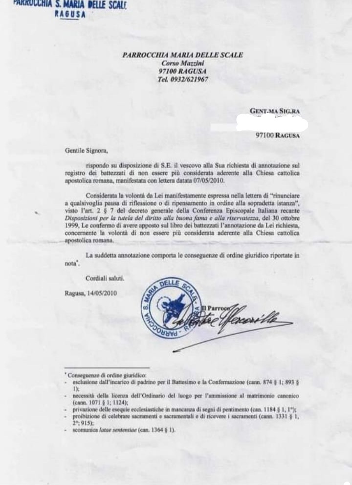Una persona ha chiesto la rettifica dei dati relativi al proprio battesimo avvenuto a S. Maria delle Scale - RAGUSA (RG) il 14/05/2010, dichiarando di non voler più far parte della Chiesa Cattolica.