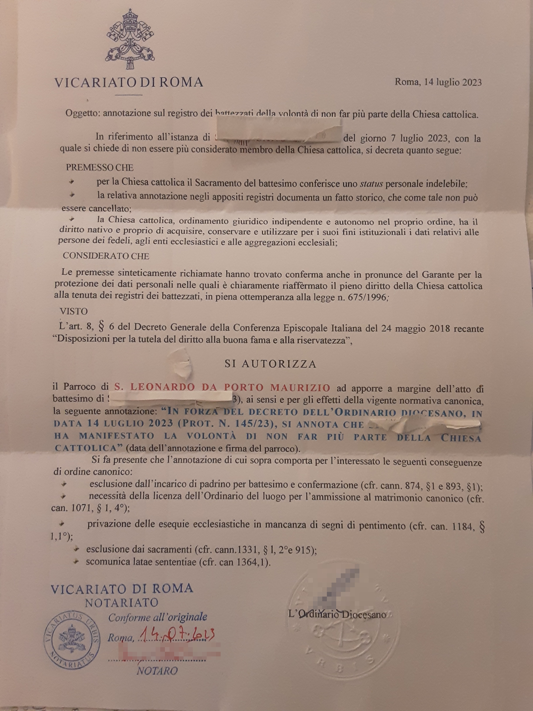 Una persona ha chiesto la rettifica dei dati relativi al proprio battesimo avvenuto a S. Leonardo Da Porto Maurizio - ROMA (RM) il 14/07/2023, dichiarando di non voler più far parte della Chiesa Cattolica.