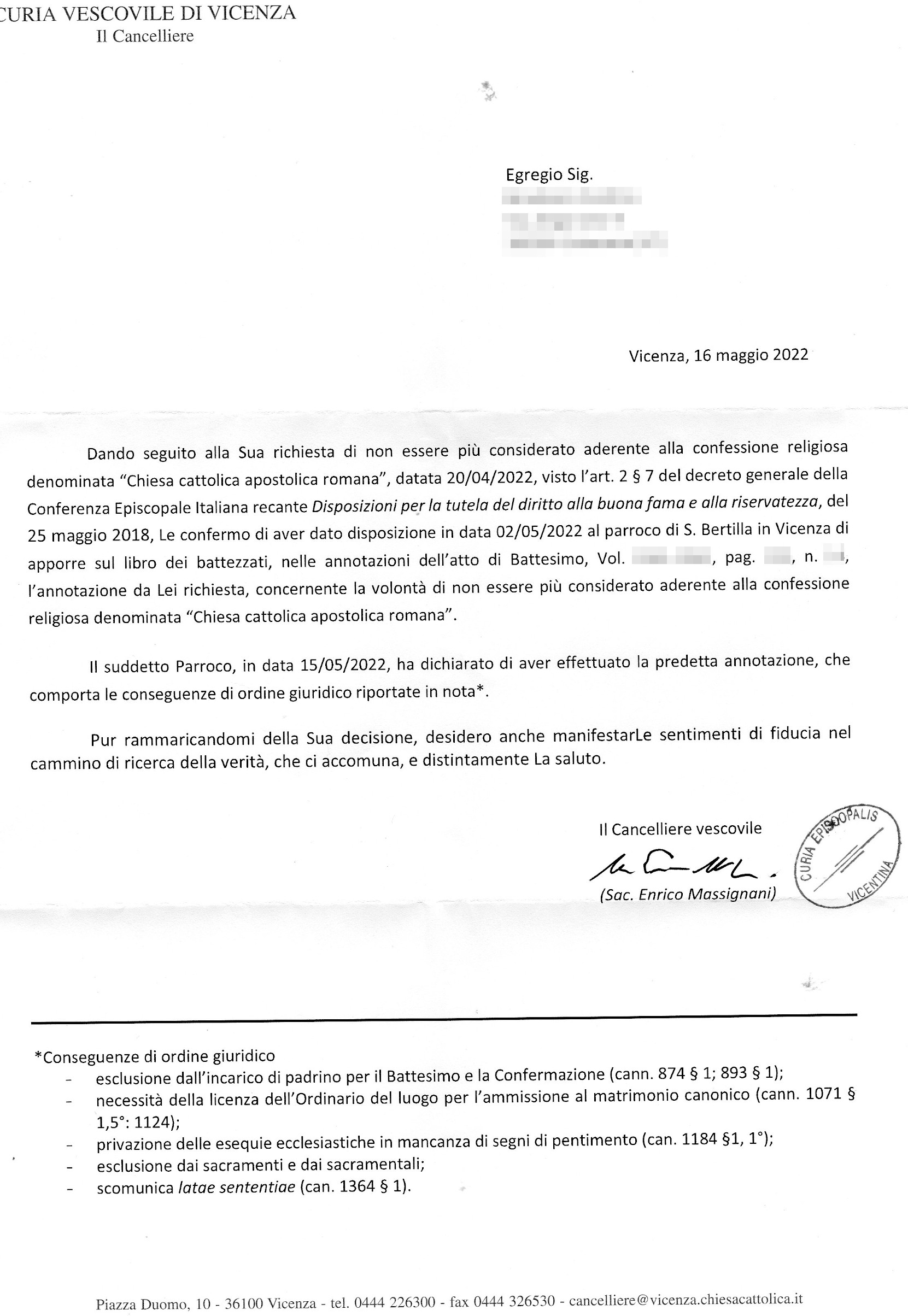 Una persona ha chiesto la rettifica dei dati relativi al proprio battesimo avvenuto a S. Maria Bertilla - VICENZA (VI) il 15/05/2022, dichiarando di non voler più far parte della Chiesa Cattolica.