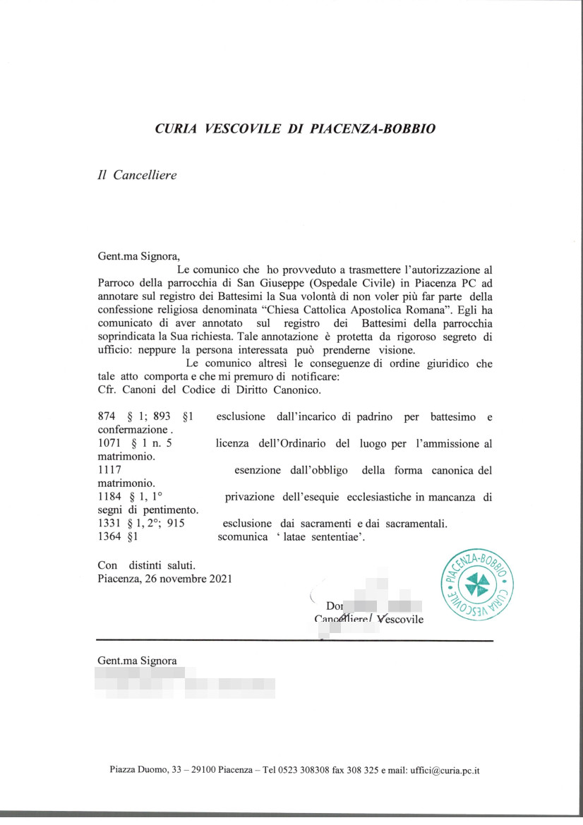 Una persona ha chiesto la rettifica dei dati relativi al proprio battesimo avvenuto a S. Sepolcro - PIACENZA (PC) il 26/11/2021, dichiarando di non voler più far parte della Chiesa Cattolica.