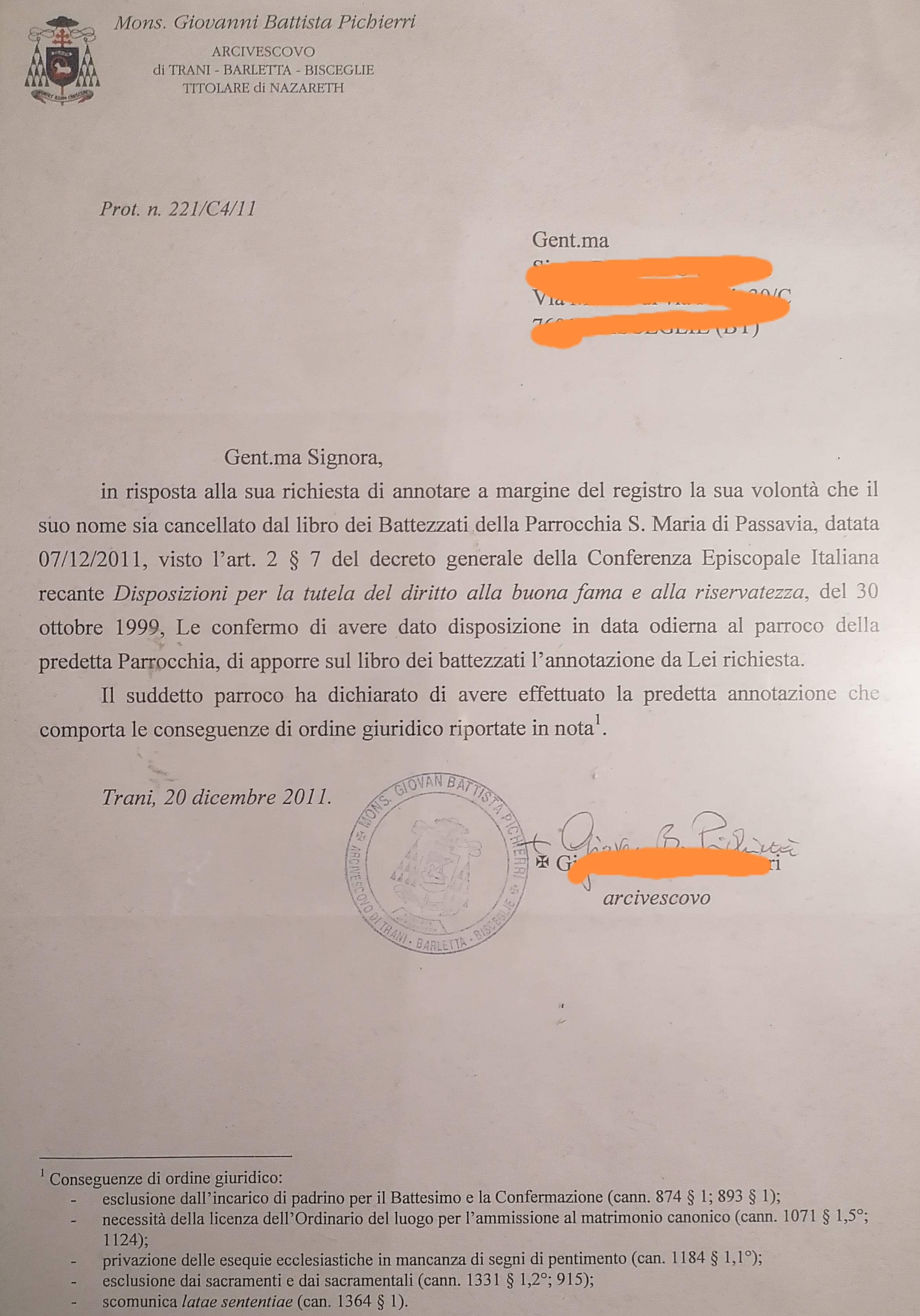 Una persona ha chiesto la rettifica dei dati relativi al proprio battesimo avvenuto a S. Maria di Passavia - BISCEGLIE (BT) il 20/12/2011, dichiarando di non voler più far parte della Chiesa Cattolica.
