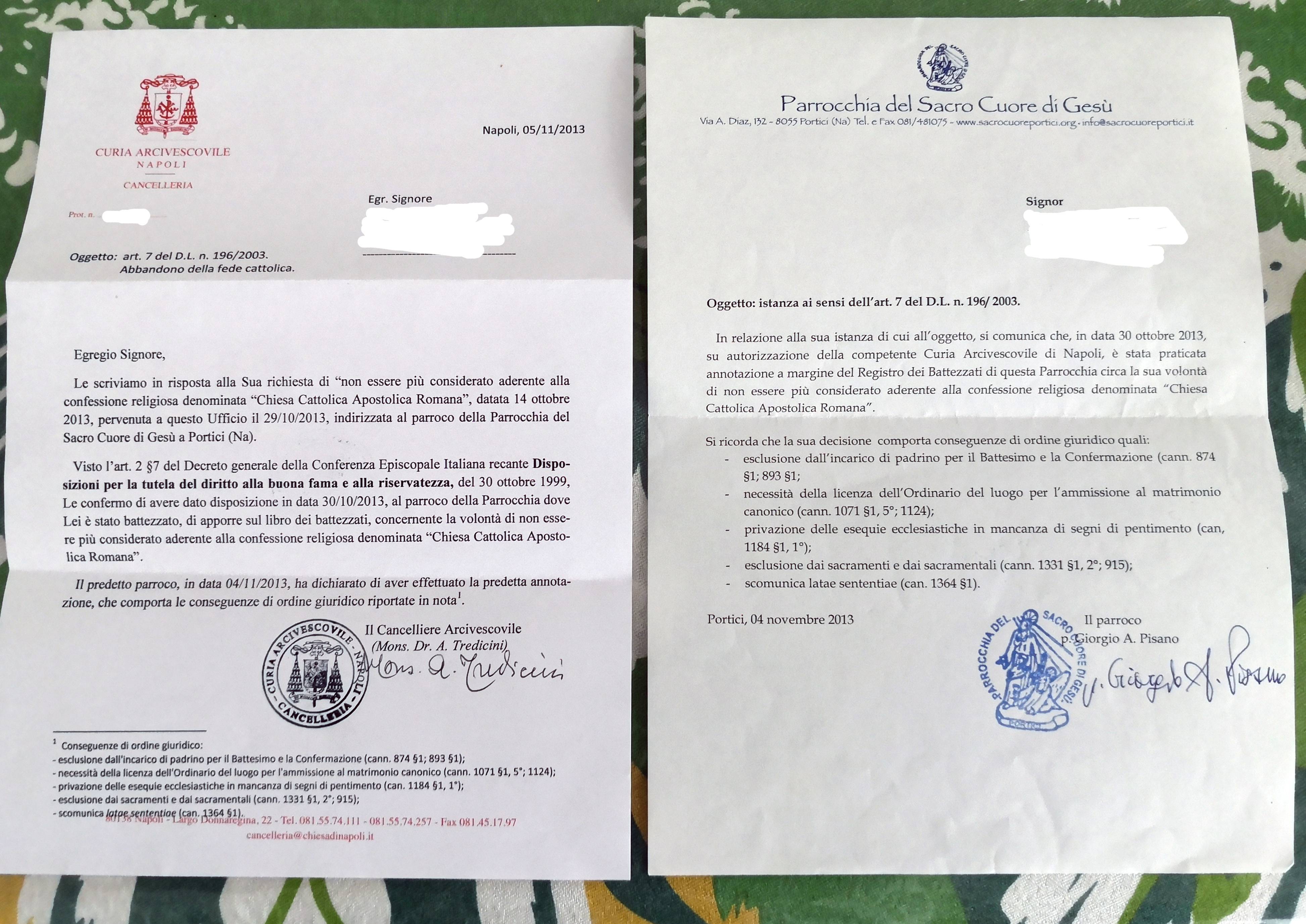 Una persona ha chiesto la rettifica dei dati relativi al proprio battesimo avvenuto a Sacro Cuore di Gesù - PORTICI (NA) il 23/10/2013, dichiarando di non voler più far parte della Chiesa Cattolica.