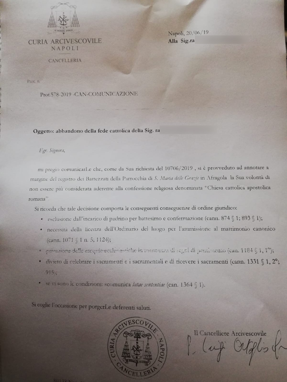 Una persona ha chiesto la rettifica dei dati relativi al proprio battesimo avvenuto a Santa Maria delle Grazie - AFRAGOLA (NA) il 20/06/2019, dichiarando di non voler più far parte della Chiesa Cattolica.
