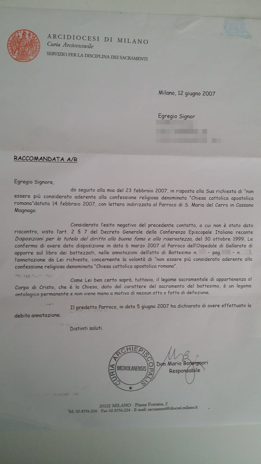 Una persona ha chiesto la rettifica dei dati relativi al proprio battesimo avvenuto a S. Maria del Cerro - CASSANO MAGNAGO (VA) il 12/06/2007, dichiarando di non voler più far parte della Chiesa Cattolica.